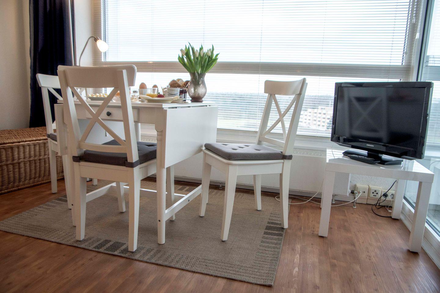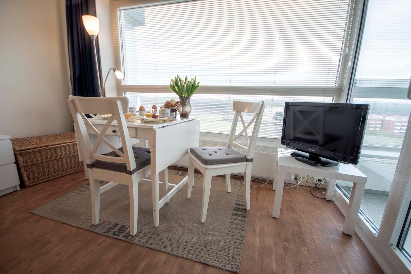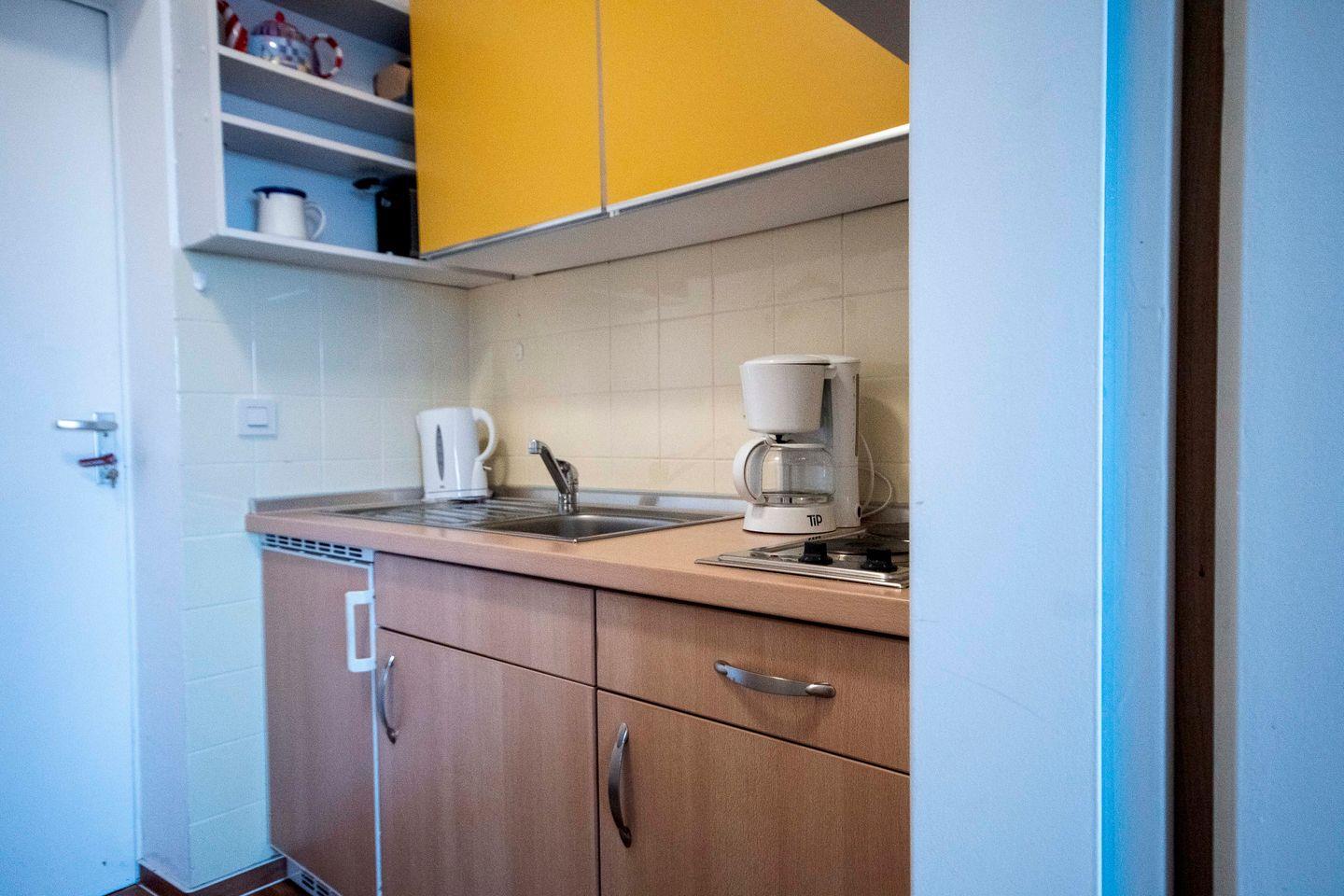 Die Wohnung erstreckt sich über 25 m² im 8. Stock und ist bequem mit einem Aufzug zu erreichen. Die Wohnung bietet Platz für bis zu drei Personen und ist ideal für Familien oder Paare auf der Suche nach einer erholsamen Zeit am Meer. Das Apartment ist mit einem 160cm breiten ausziehbaren Tagesbett und einem Schrank-Klappbett ausgestattet. Mit einer gut ausgestatteten Kochnische, inklusive Herd, Kühlschrank, Mikrowelle, Kaffeemaschine, Toaster und Wasserkocher, haben Sie die Möglichkeit, Ihre eigenen Mahlzeiten zu zubereiten und beim Kochen gleichzeitig den Blick auf das Meer zu genießen. Ein Esstisch steht Ihnen zur Verfügung, um zusammenzusitzen und die kulinarischen Köstlichkeiten zu genießen.