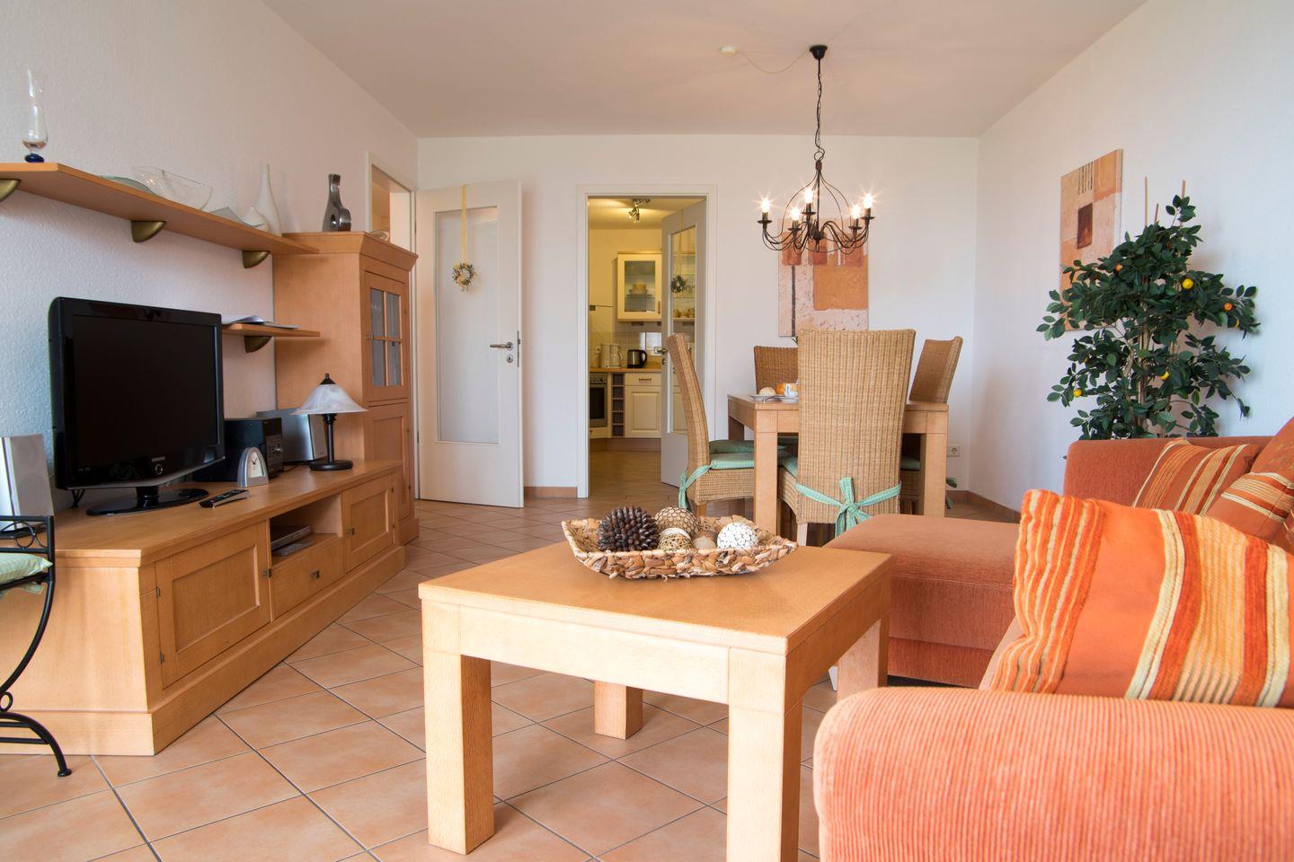 Diese Ferienwohnung liegt direkt an der Promenade neben dem Ahoi-Meerwasser-Schwimmbad. Die exklusive Einrichtung wird sie beeindrucken. Die Wohnung verfügt über 2 separate Schlafzimmer, eines mit Doppelbett, das andere mit einem bequemen Schlafsofa. Die voll ausgestattete Küche, das komfortable Bad mit Dusche und Wanne, der möblierte Balkon sowie der großzügige Wohnraum sorgen für einen angenehmen Aufenthalt.