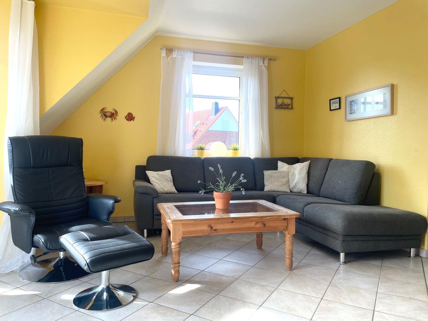 Das Wohnzimmer bietet mit einer gemütlichen Sofaecke ausreichend Platz zum Entspannen. Hier steht Ihnen ein TV zur Verfügung. Dank WLAN-Zugang sind Sie auch im Urlaub stets online. Eine Waschmaschine steht Ihnen zur Eigennutzung bereit.