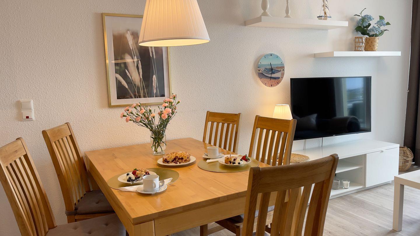 Der Wohnraum verfügt über ein gemütliches Sofa sowie einen Essbereich, in dem Sie in geselliger Runde den Abend ausklingen lassen können.