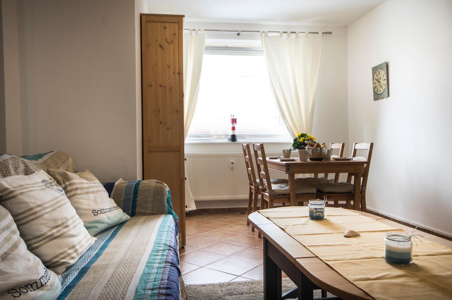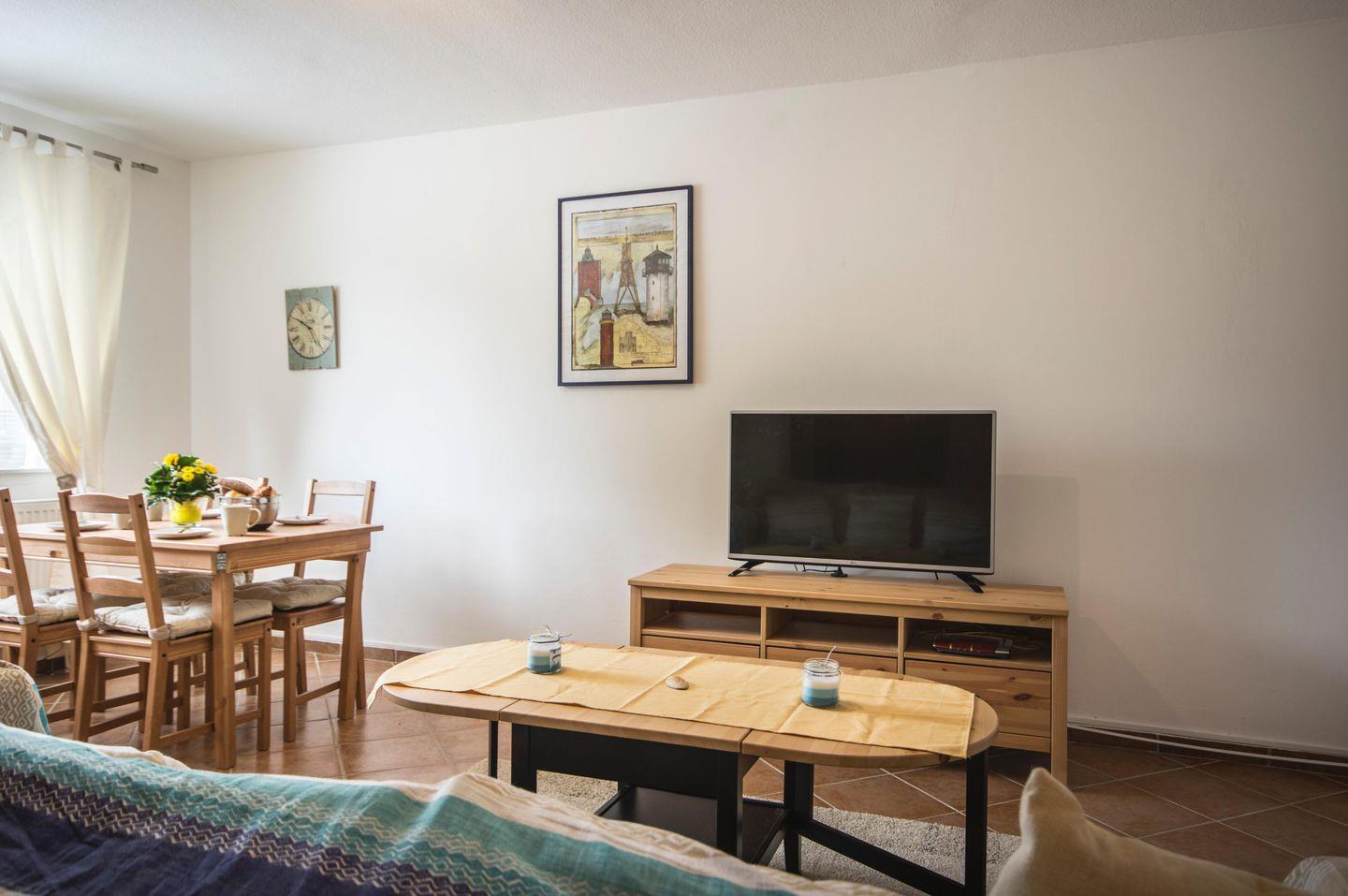 Die Ferienwohnung ist freundlich eingerichtet und verfügt über eine gut ausgestattete Einbauküche mit Geschirrspüler und Mikrowelle. Ein großzügiges Wohnzimmer mit Schlafcouch, ein separates Schlafzimmer, ein modernes Duschbad sowie eine Terrasse bieten ausreichend Platz für einen erholsamen Aufenthalt.