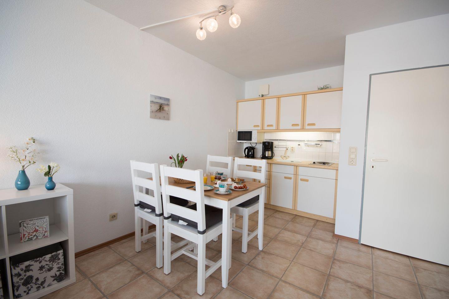 Die Ferienwohnung besteht aus einem Schlafzimmer, einem Badezimmer und einem offenen Wohnbereich, der geschickt mit der voll ausgestatteten Küche verbunden ist. Perfekt ausgestattet für Ihren Aufenthalt, finden Sie hier alles, was Sie benötigen: Geschirr und Besteck, einen Herd mit 2 Platten, eine Mikrowelle, einen Wasserkocher, eine Kaffeemaschine und einen Toaster. Nach einem aufregenden Tag können Sie sich am Esstisch oder in der Sofaecke entspannen und die Zeit gemeinsam genießen.