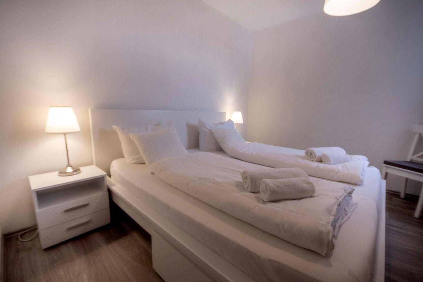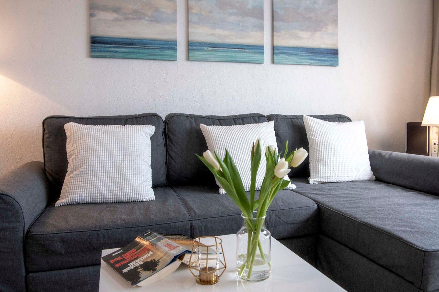 Die Ferienwohnung überzeugt durch ihre durchdachte Ausstattung und moderne Einrichtung. Sie betreten die Wohnung und finden sich in einem einladenden Wohnbereich mit gemütlicher Sofaecke und einem Essbereich wieder, der genug Platz für gemeinsame Mahlzeiten bietet. Die Küche ist vollständig ausgestattet und bietet einen 4-Platten-Herd, Backofen, Kühlschrank mit Gefrierfach, sowie alle nötigen Küchenutensilien. Hier bereiten Sie im Handumdrehen leckere Mahlzeiten zu.