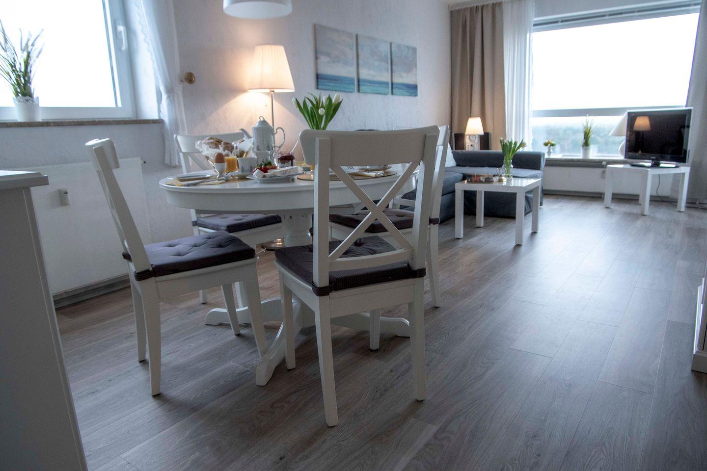 Moderne Ferienwohnung in Cuxhaven mit Meerblick, Balkon, Schwimmbad und Sauna, nur 300 m vom Strand entfernt.