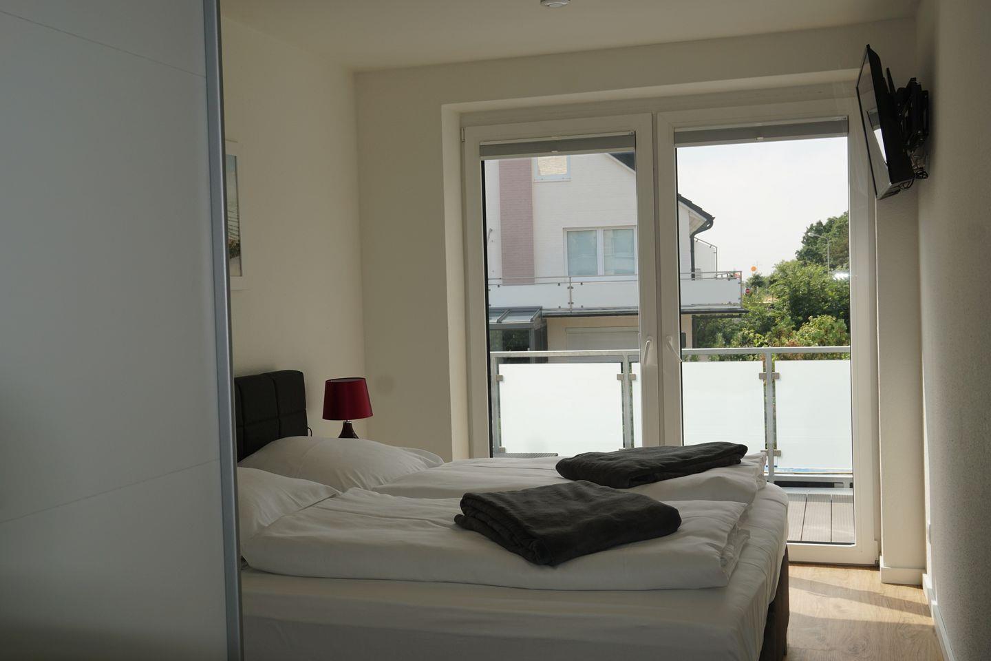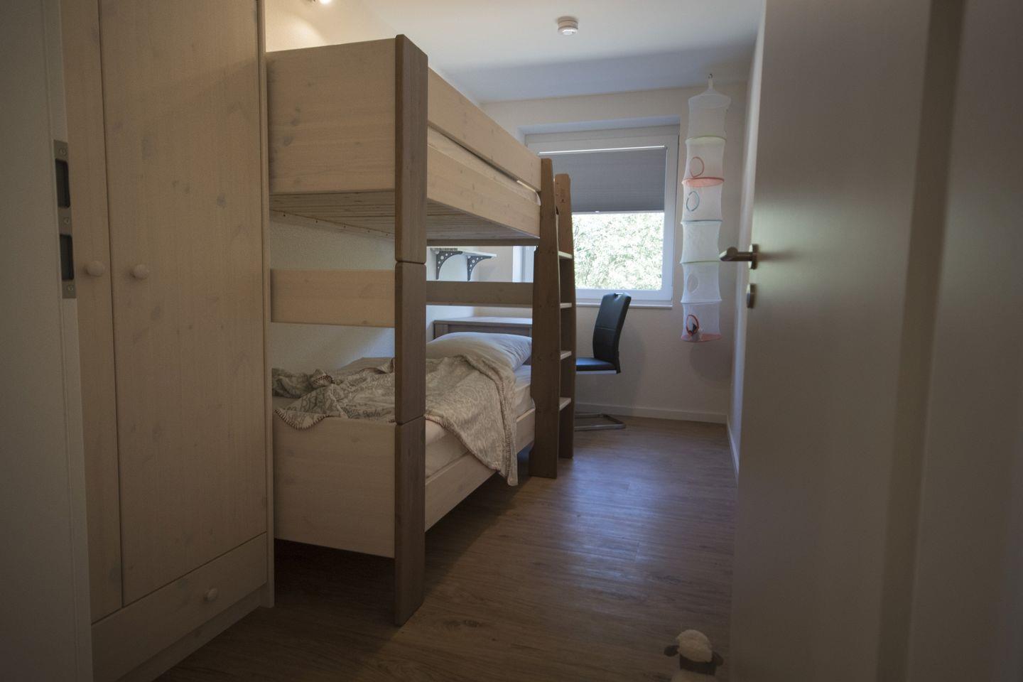 Ferienwohnung verfügt über 2 Schlafräume, die einmal mit einem Boxspringbett und einmal mit einem Etagenbett ausgestattet sind.