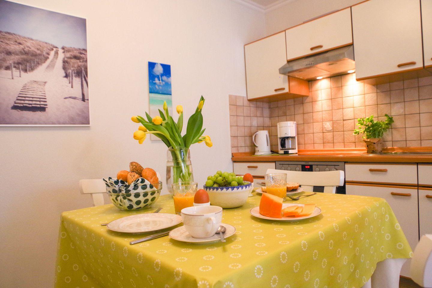 Neben einem separaten Schlafzimmer steht im Wohnbereich ein komfortables Klappbett zur Verfügung. Die gut ausgestattete Küchenzeile bietet u. a. Backofen, Cerankochfeld, Wasserkocher und Kaffeemaschine – perfekt für entspannte Mahlzeiten in eigener Regie.