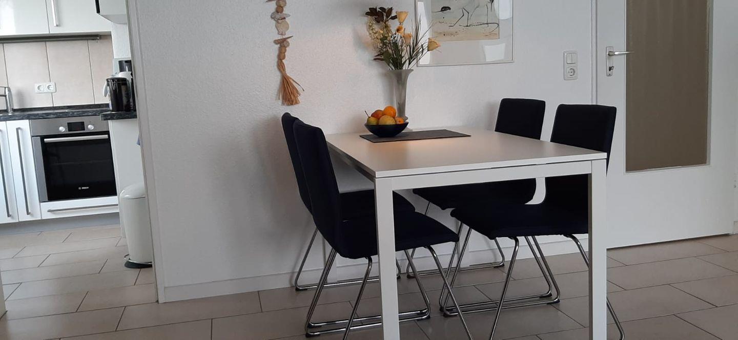 Die zuletzt 2015 renovierte moderne Küche ist separat gelegen und bestens ausgestattet. Ein besonders schöner Platz zu zweit, ist der kleine Essbereich am Eckfenster mit Blick auf Wattwagen, die umliegende Natur und das Wattenmeer-Besucherzentrum.