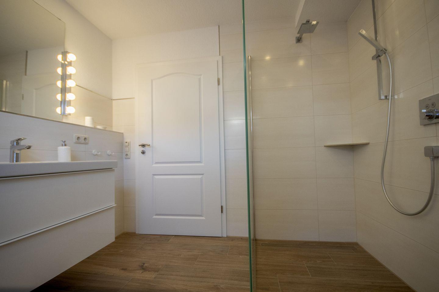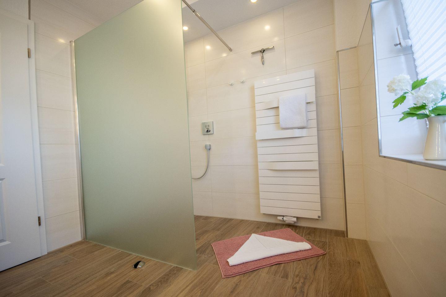 Das moderne Badezimmer ist behindertenfreundlich mit ebenerdiger, großer Walk-In-Dusche ausgestattet.