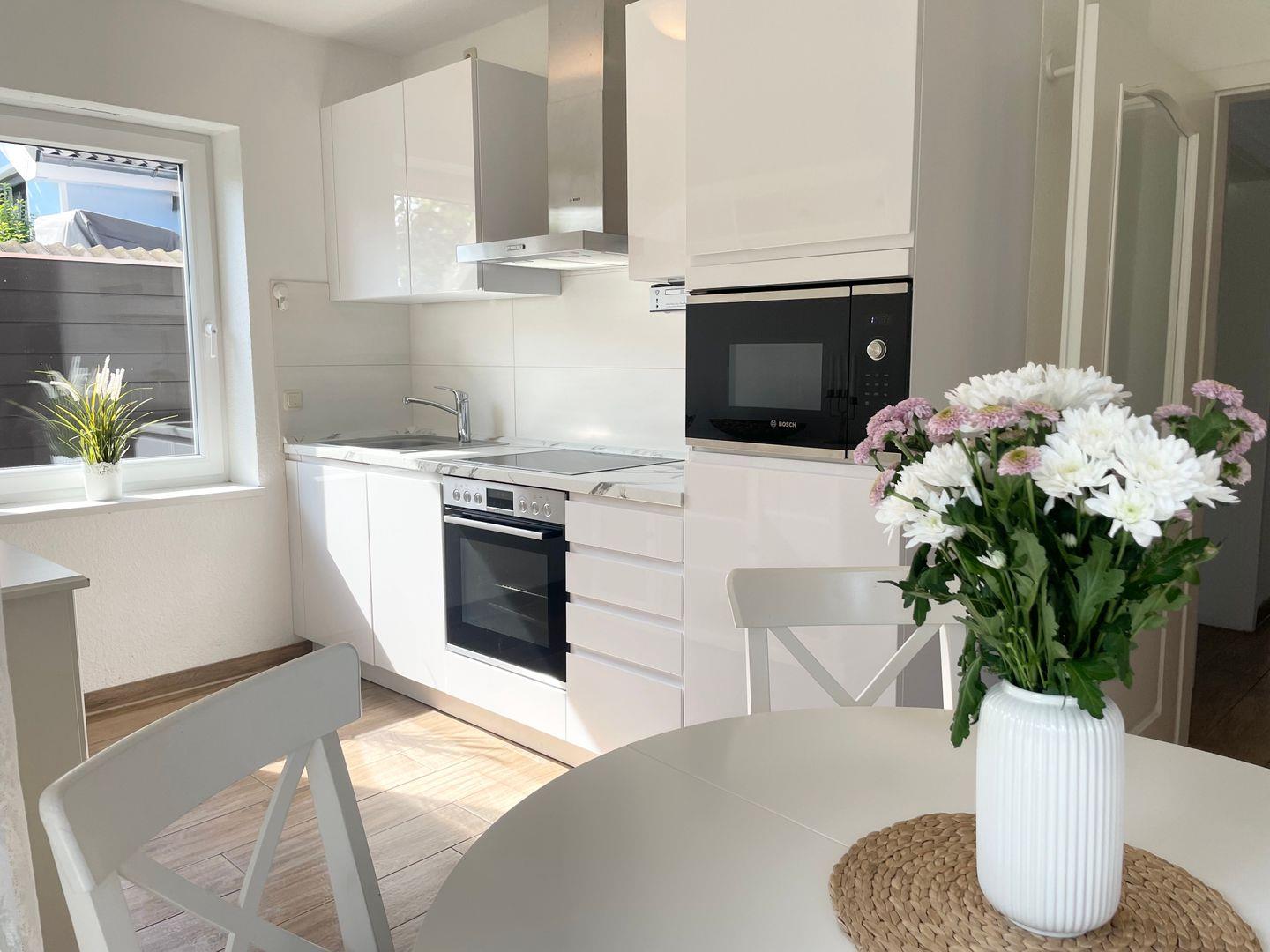 Die offene Küchenzeile ist voll ausgestattet (Geschirrspüler, Induktionsherd, Mikrowelle, Backofen, Kaffeemaschine, Wasserkocher etc.) und lässt keine Wünsche offen.