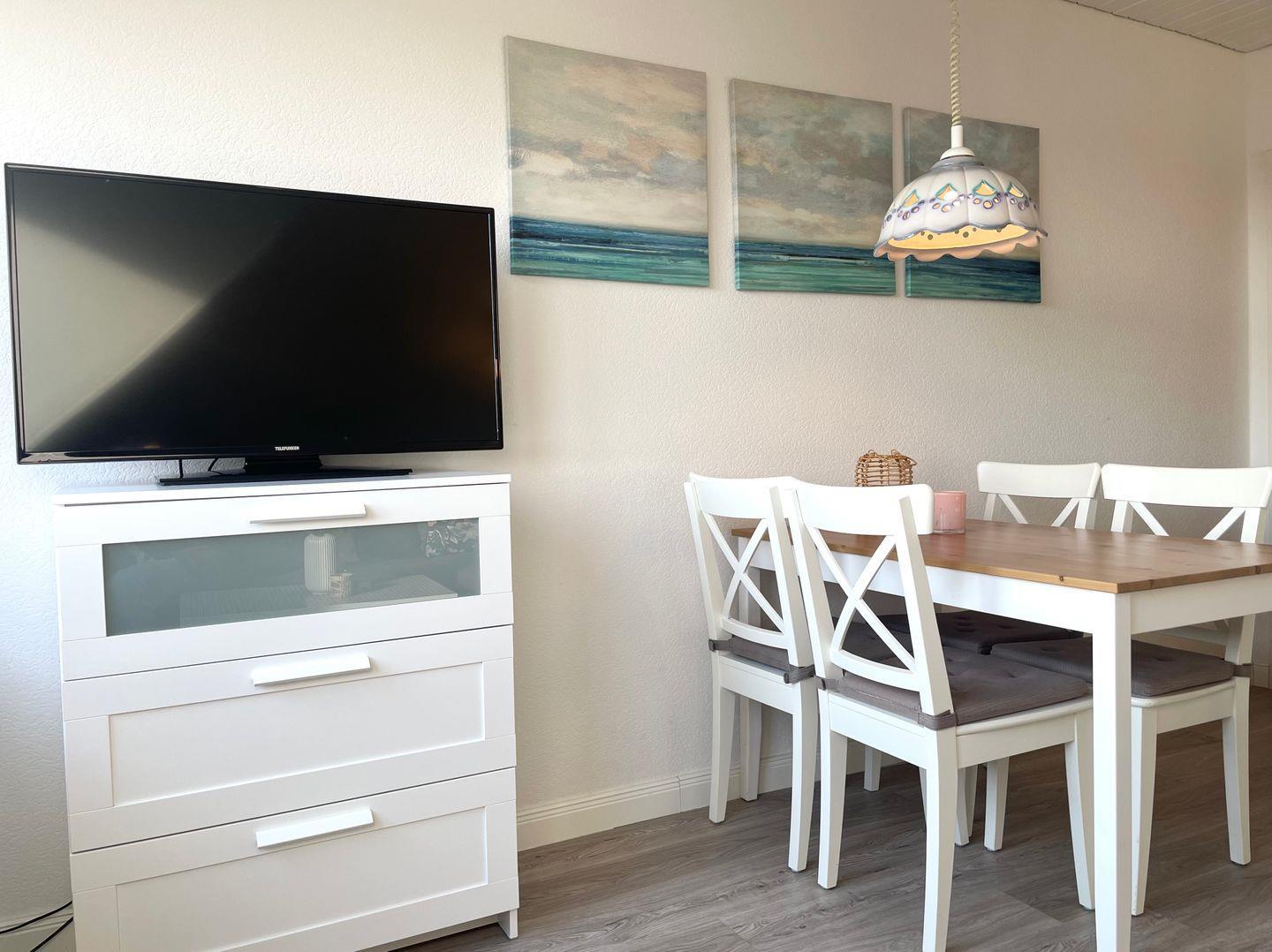 Die Wohnung verfügt über ein gemütliches Schlafzimmer, das zum Träumen einlädt. Der offene Wohnbereich ist mit einer modernen, voll ausgestatteten Küche kombiniert. Hier können Sie nicht nur alltägliche Mahlzeiten zubereiten, sondern auch ein gemeinsames Frühstück oder Abendessen am Esstisch genießen. Die Kochutensilien sind reichlich vorhanden – seien es der 4-Platten-Herd, der Backofen oder die Spülmaschine, die das Kochen und Aufräumen schnell erledigt. Nach einem langen Tag am Strand können Sie sich im gemütlichen Sofa niederlassen und vor dem TV entspannen.