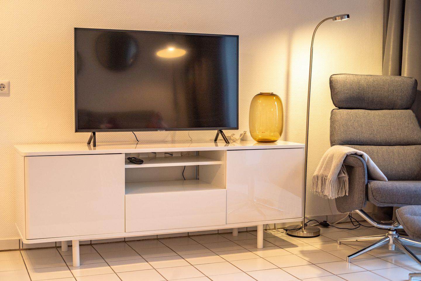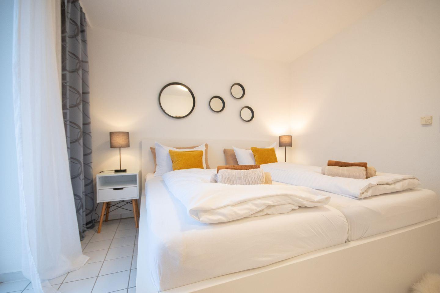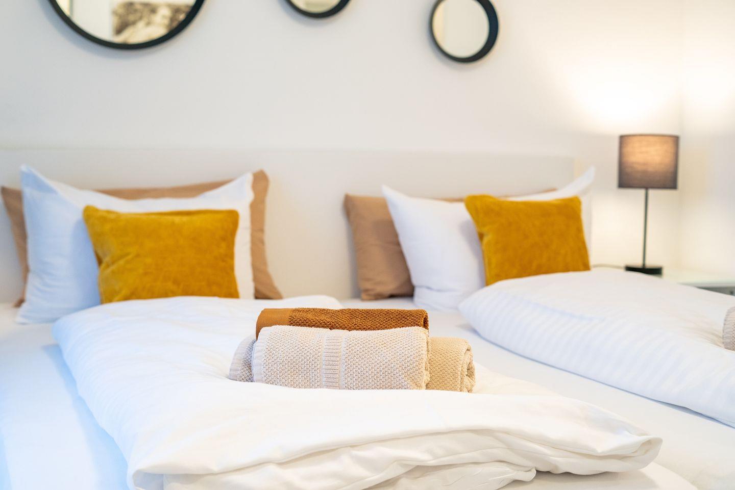 Innen erwarten dich ein gemütlicher Wohnbereich mit Schlafsofa, ein separates Schlafzimmer mit Doppelbett und begehbarem Kleiderschrank sowie eine gut ausgestattete Küche und ein modernes Duschbad.