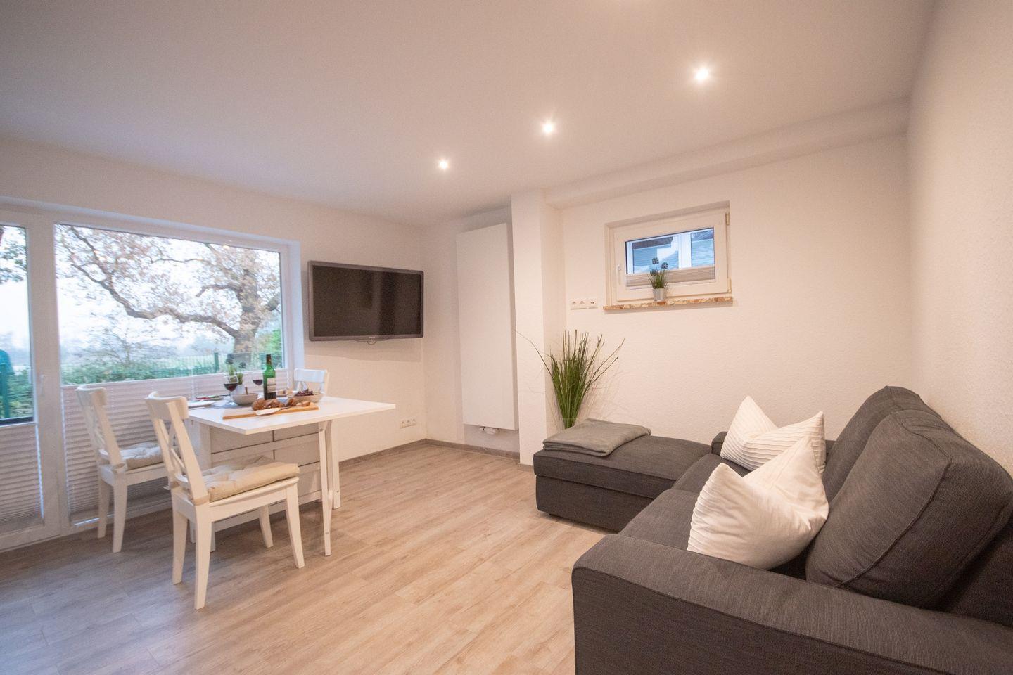 Die Unterkunft zeichnet sich durch ein lichtdurchflutetes Wohnkonzept mit einem offenen Küchenbereich aus. In der voll ausgestatteten Küche finden Sie alles, was Sie benötigen, um Mahlzeiten zuzubereiten, einschließlich eines 2-Platten-Herdes, Backofens, Kühlschranks, Geschirrspülers, Mikrowelle sowie einer Kaffeemaschine und eines Wasserkochers. Der angrenzende Essbereich lädt dazu ein, gemeinsame Mahlzeiten zu genießen. Im gemütlichen Wohnbereich können Sie entspannende Stunden verbringen.