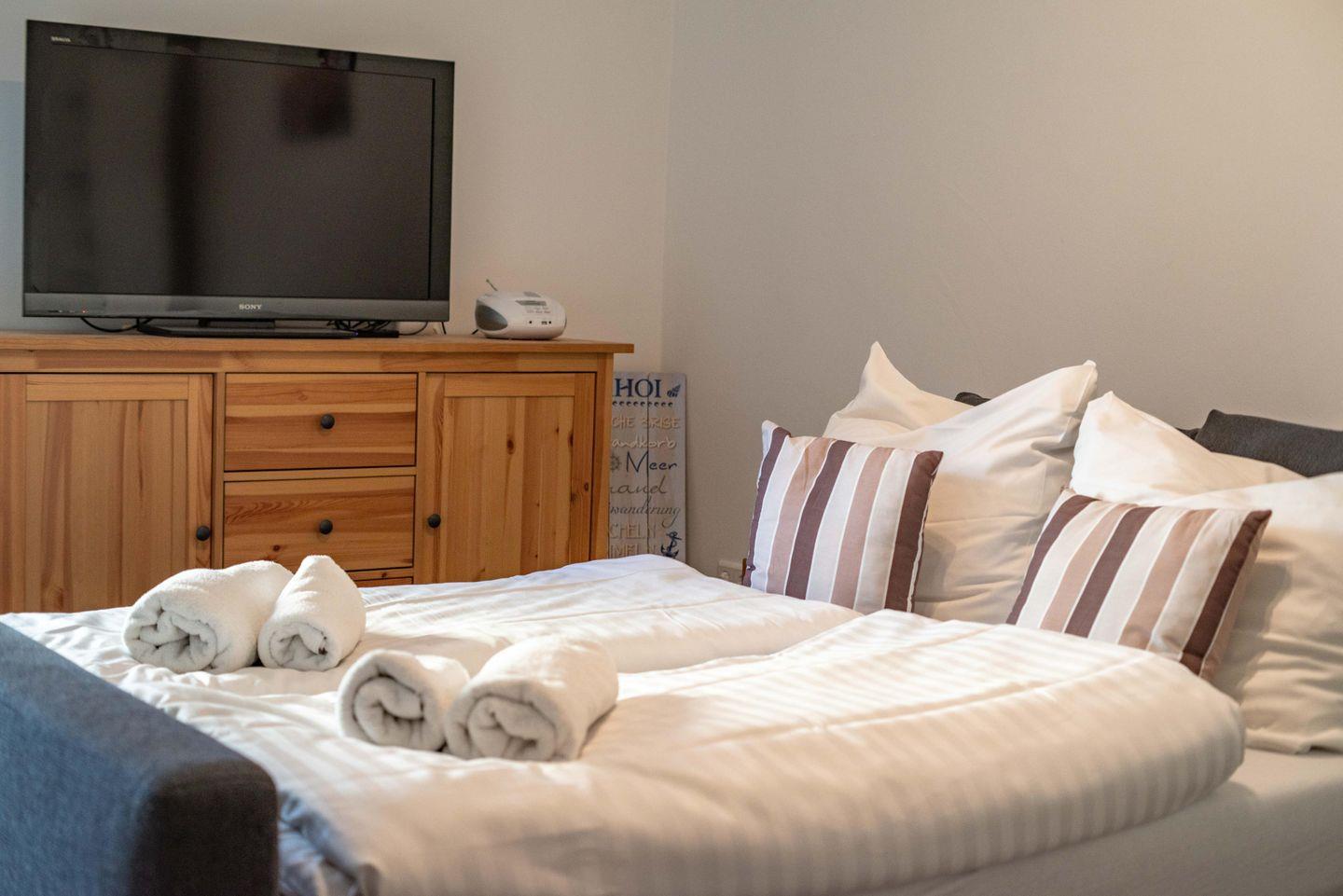 Die Ferienwohnung selbst überzeugt durch ihre freundliche und moderne Ausstattung. Sie verfügt über eine umfangreich ausgestattete Einbauküche, einen Fernseher sowie WLAN. Ihnen stehen ein separates Schlafzimmer mit Einzelbett und ein gemütliches Wohnzimmer mit Schlafcouch (ca.1,40 breit) zur Verfügung. Das komfortable Badezimmer ist mit einer Dusche ausgestattet.
