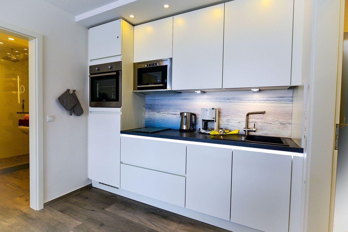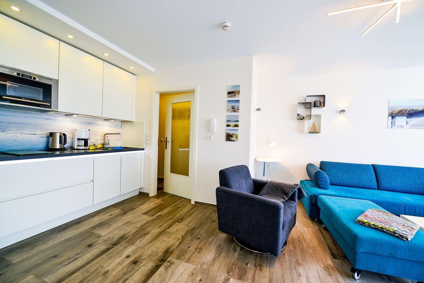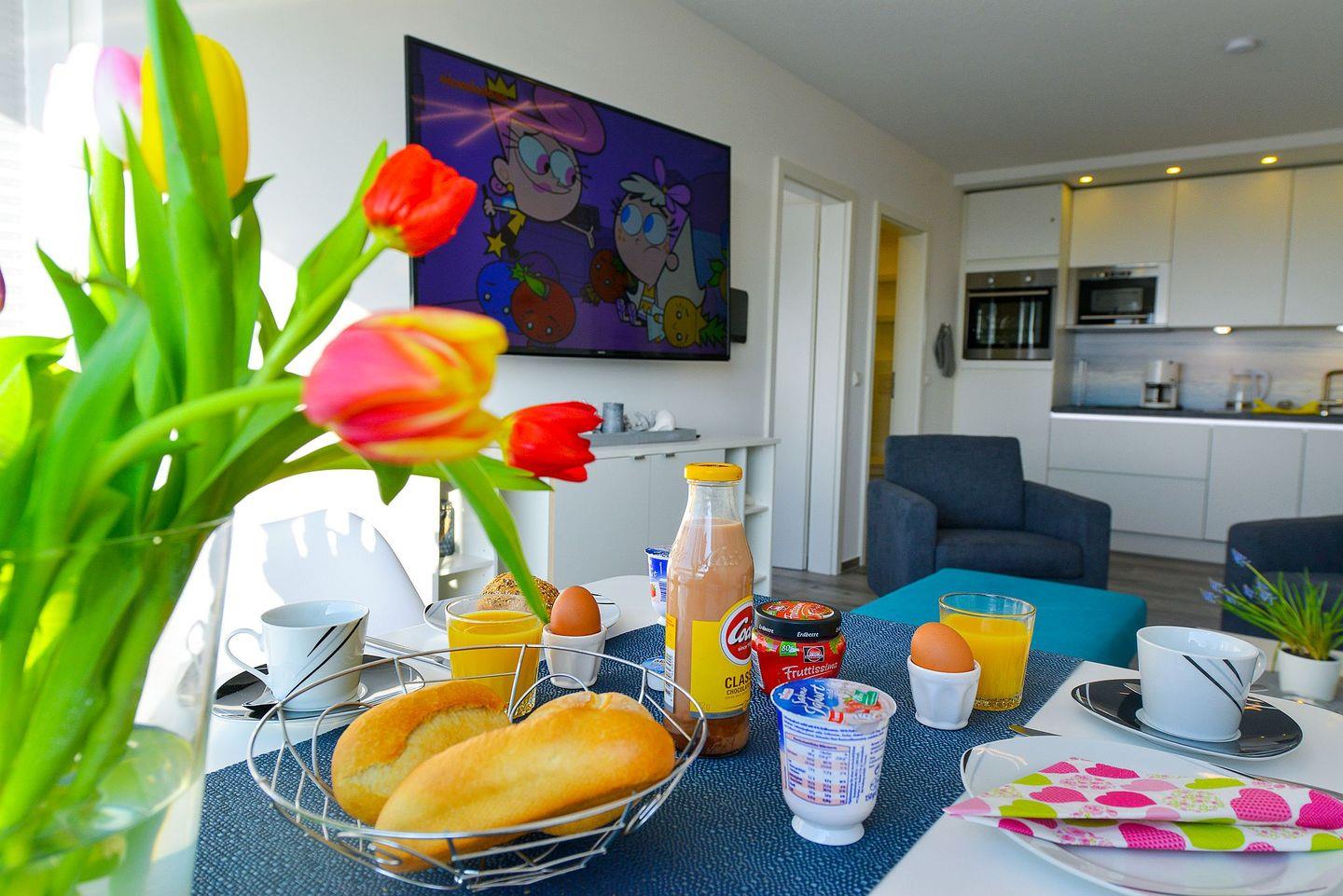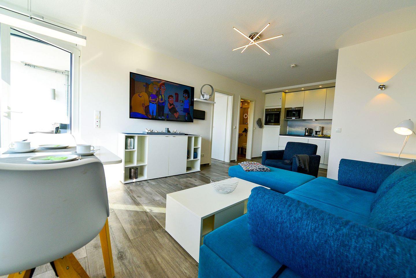 Die voll ausgestattete Küchenzeile mit Mikrowelle, Kochfeld und Kaffeemaschine ermöglicht eine unkomplizierte Selbstverpflegung. Im Wohnbereich sorgen ein großer Flatscreen-TV und kostenfreies WLAN für entspannte Abende. Vom überdachten Westbalkon genießen Sie den direkten Blick auf die Nordsee – perfekt, um den Tag bei frischer Seeluft ausklingen zu lassen.