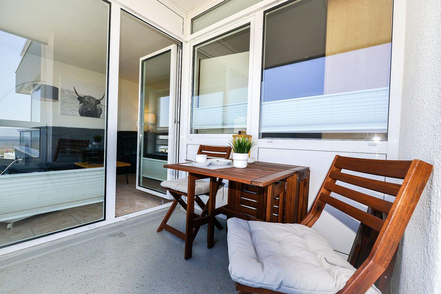 Moderne Ferienwohnung mit überdachtem Balkon und Panoramablick, nur 150 m vom Strand in Cuxhaven entfernt.