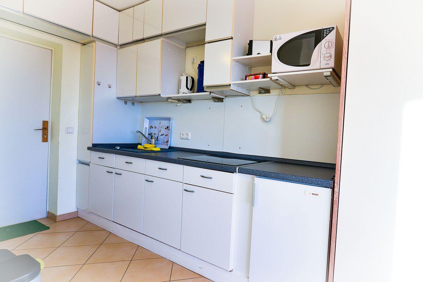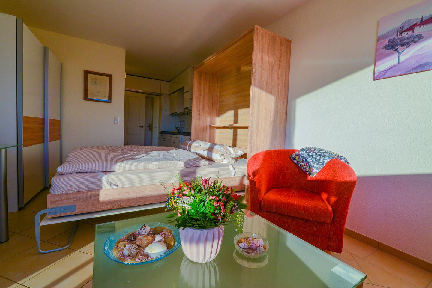 Die Wohnung bietet eine kleine, praktische Küchenzeile für die Selbstversorgung, ein modernes Bad mit Dusche sowie einen gemütlichen Wohn- und Schlafbereich. Nach einem erlebnisreichen Tag genießen Sie hier Ruhe und frische Meeresluft auf dem eigenen Balkon.