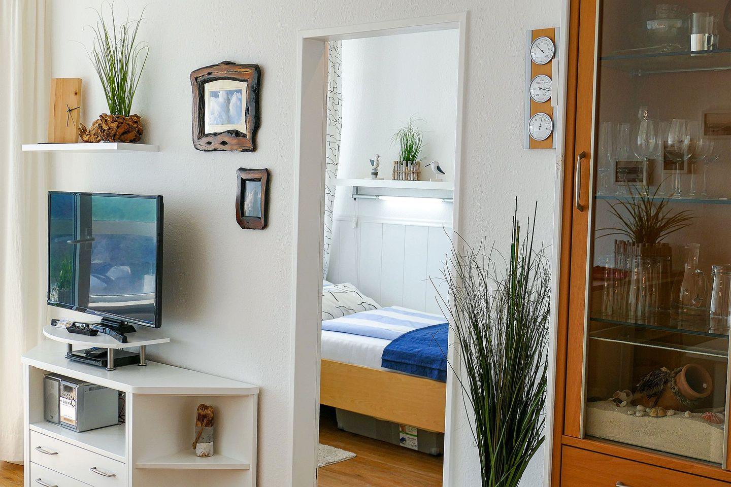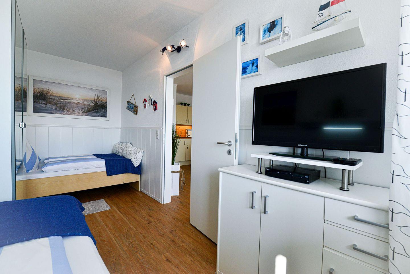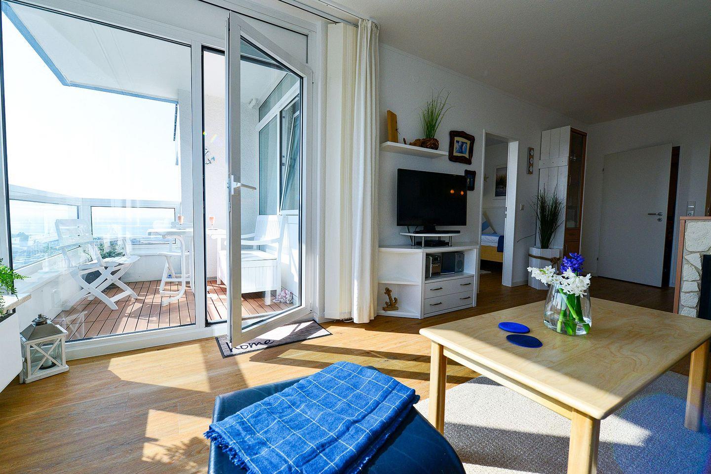 In der vollausgestatteten Küche lassen sich Mahlzeiten bequem zubereiten, während das separate Schlafzimmer mit einem zusätzlichen TV für entspannte Abende und Privatsphäre sorgt. Das Badezimmer ist funktional gestaltet und mit einer Badewanne ausgestattet – perfekt für eine erholsame Auszeit nach einem Strandtag. Ein Highlight ist das helle Wohnzimmer mit einem komfortablen Schlafsofa, von dem aus Sie sogar seitlichen Blick aufs Meer genießen können. Der überdachte Südbalkon lädt zudem dazu ein, den Abend entspannt an der frischen Meeresluft ausklingen zu lassen.