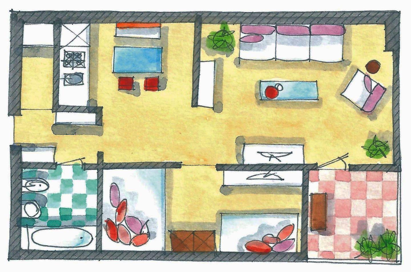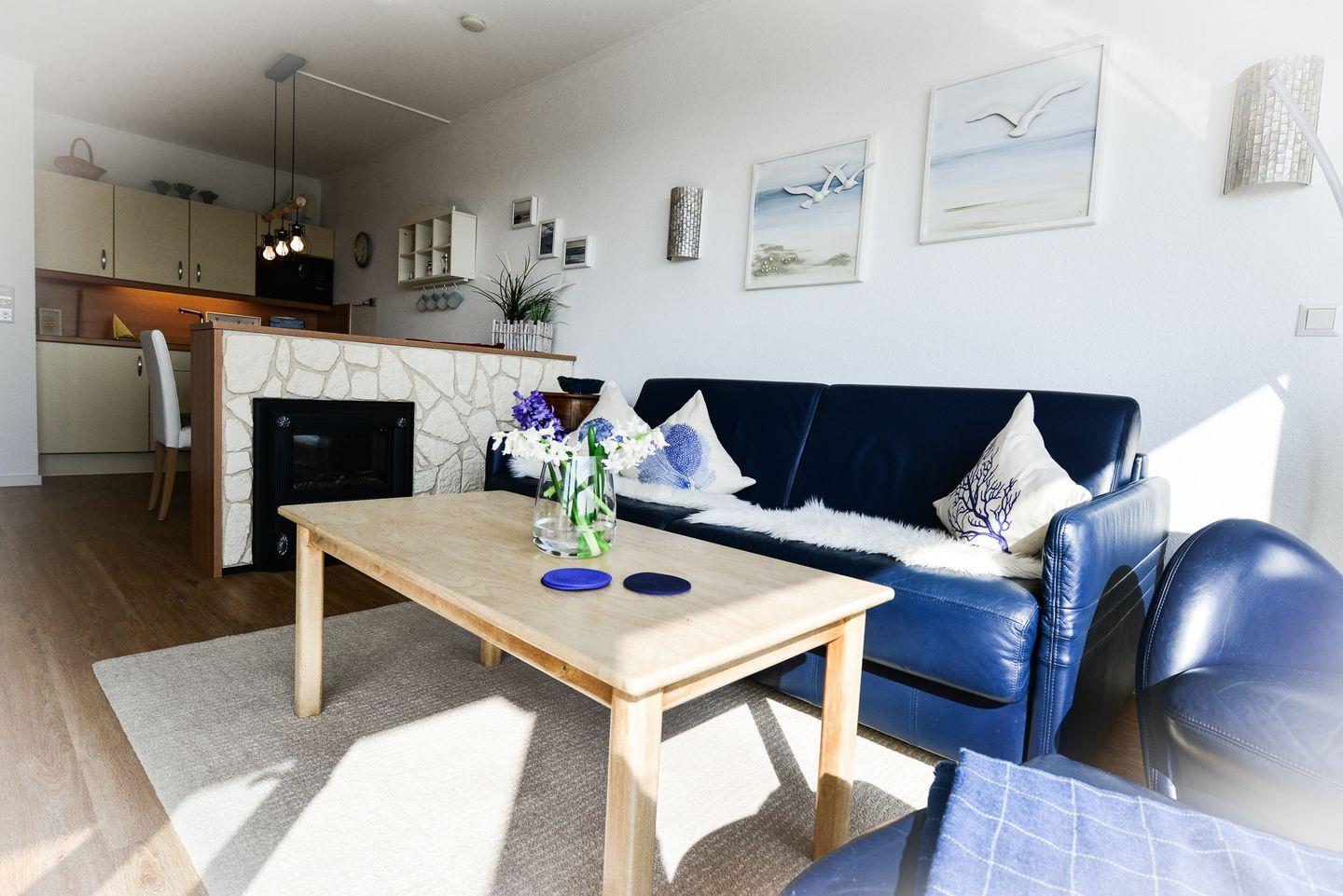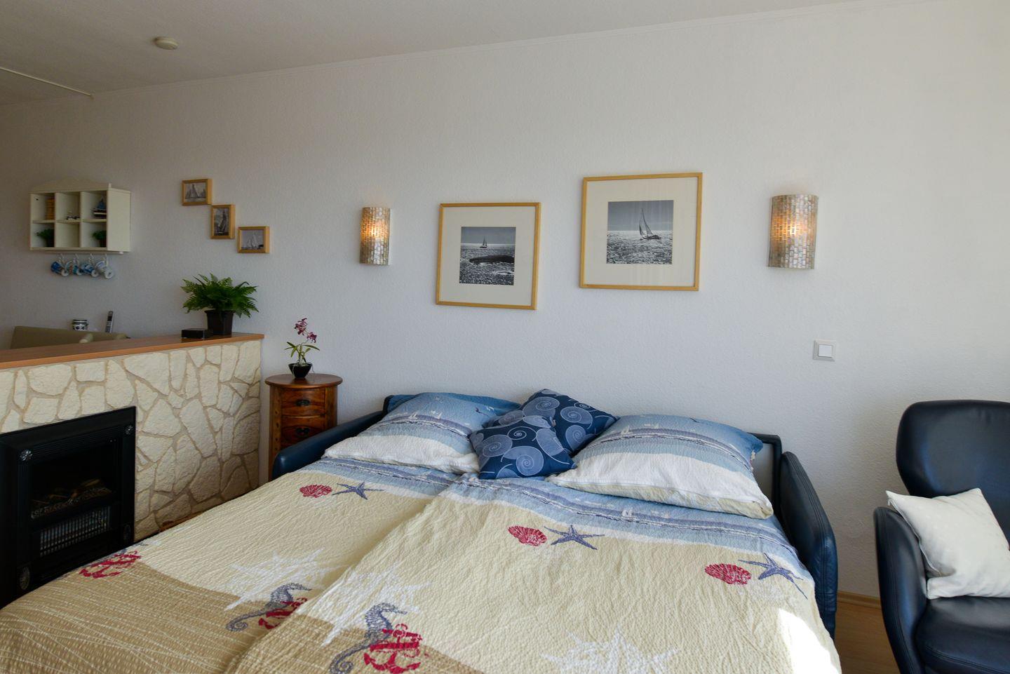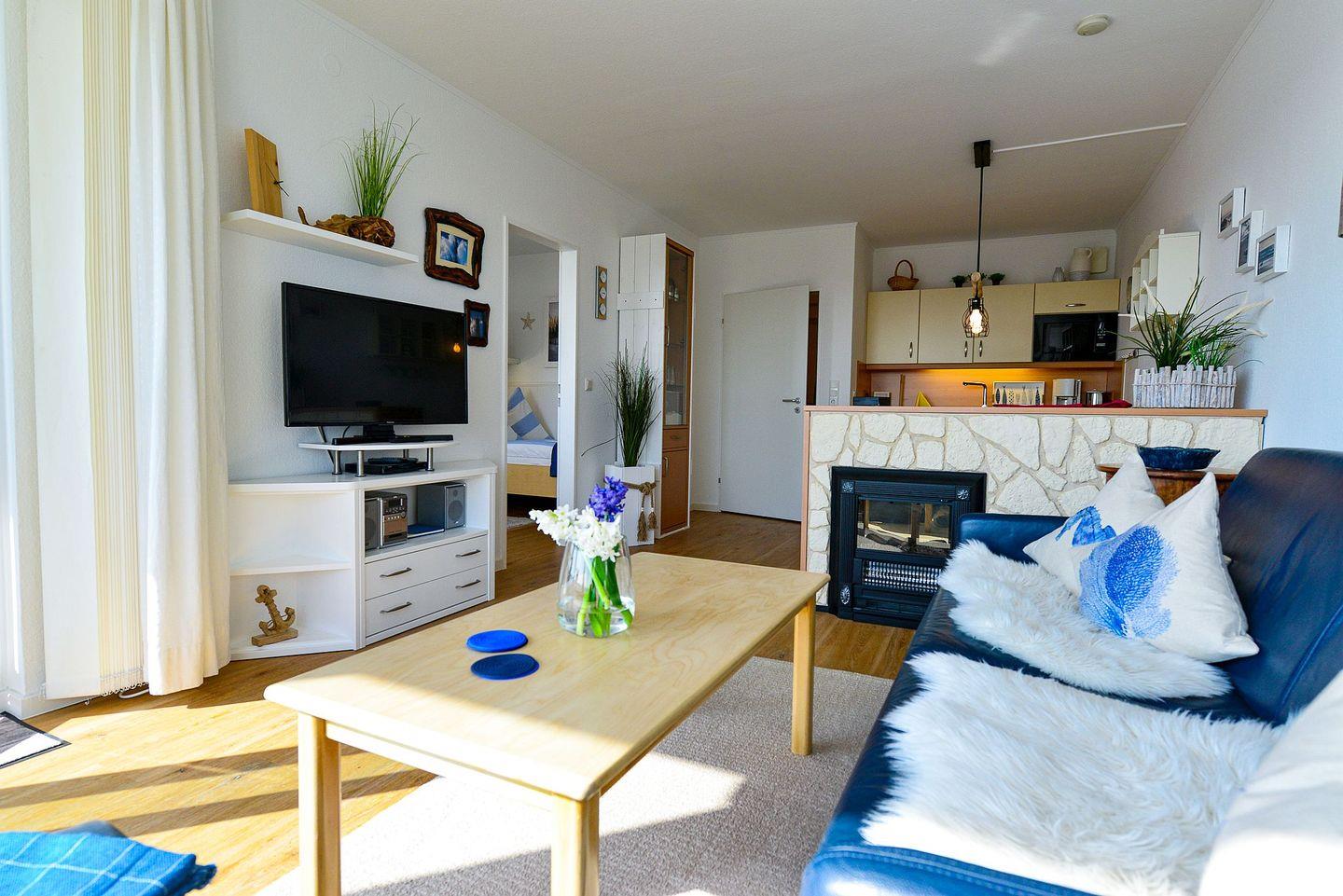 In der vollausgestatteten Küche lassen sich Mahlzeiten bequem zubereiten, während das separate Schlafzimmer mit einem zusätzlichen TV für entspannte Abende und Privatsphäre sorgt. Das Badezimmer ist funktional gestaltet und mit einer Badewanne ausgestattet – perfekt für eine erholsame Auszeit nach einem Strandtag. Ein Highlight ist das helle Wohnzimmer mit einem komfortablen Schlafsofa, von dem aus Sie sogar seitlichen Blick aufs Meer genießen können. Der überdachte Südbalkon lädt zudem dazu ein, den Abend entspannt an der frischen Meeresluft ausklingen zu lassen.