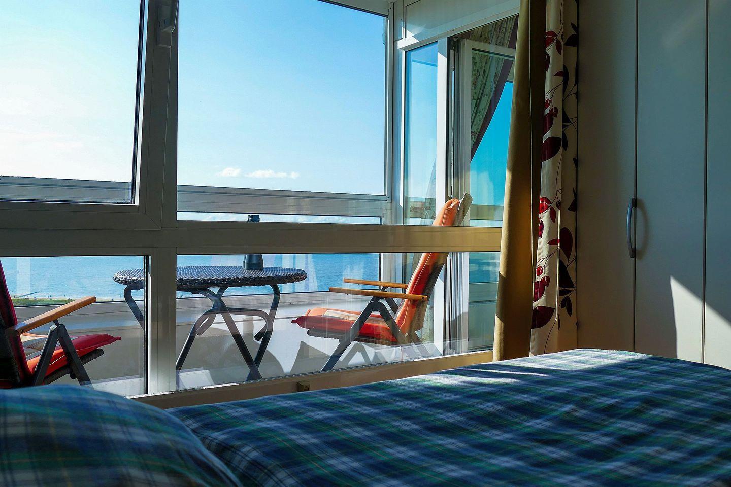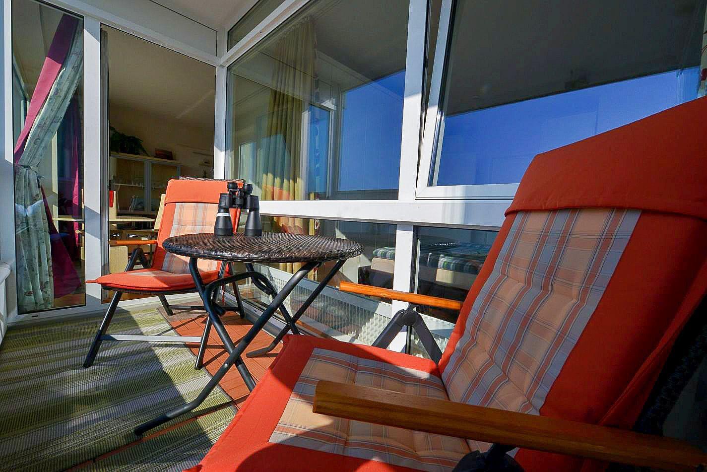 Für die Zeit nach langen Strandtagen bietet sich der überdachte und verglaste Westbalkon, der sich komplett öffnen lässt, dazu an, den Abend an der Meeresluft ausklingen und die Blicke, vom 14. Stock aus, über das Meer schweifen zu lassen.