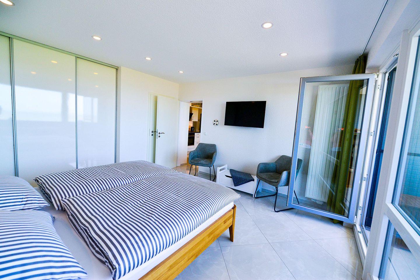 Beginnen Sie jeden Urlaubstag mit dem Ausblick aus der verglasten Fensterfront zum Öffnen mit Panoramameerblick und verbringen Sie anschließend einen wunderbaren Tag am Strand. So oder so ähnlich könnte der Beginn eines typischen Urlaubstags in dieser Traumferienwohnung verlaufen.