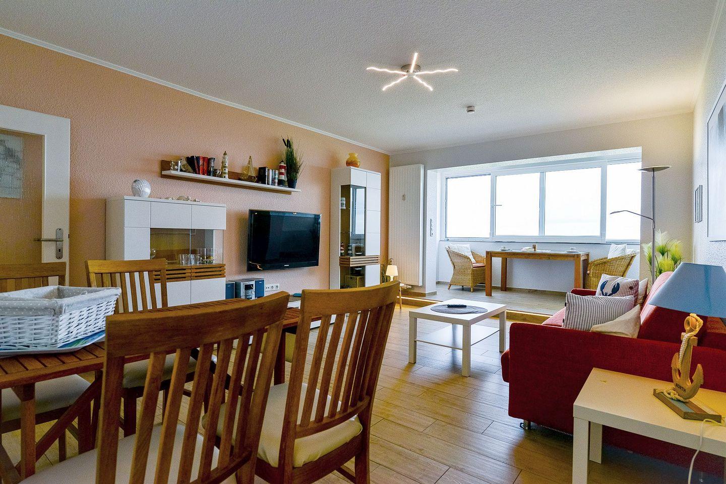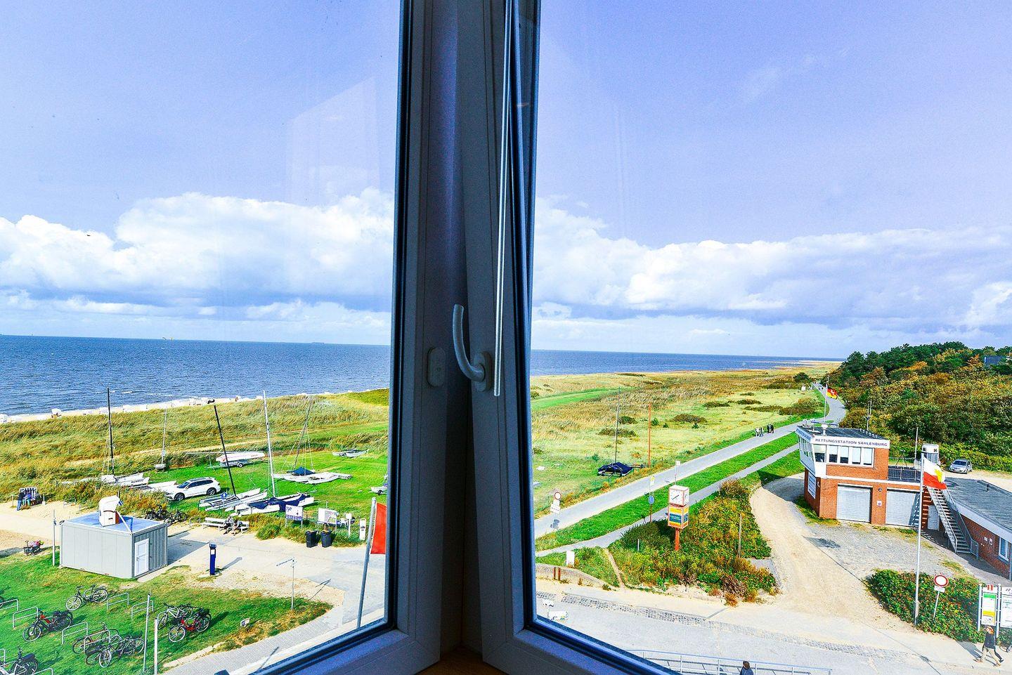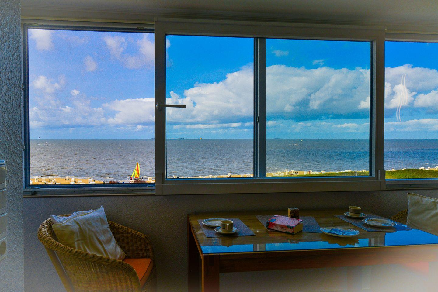 Der verglaste Balkon, der sich komplett öffnen lässt, sorgt dafür, dass Sie stets von bester Meeresluft umgeben sind und bietet Ihnen einen erstklassigen Panoramablick aufs Meer und die Insel Neuwerk.