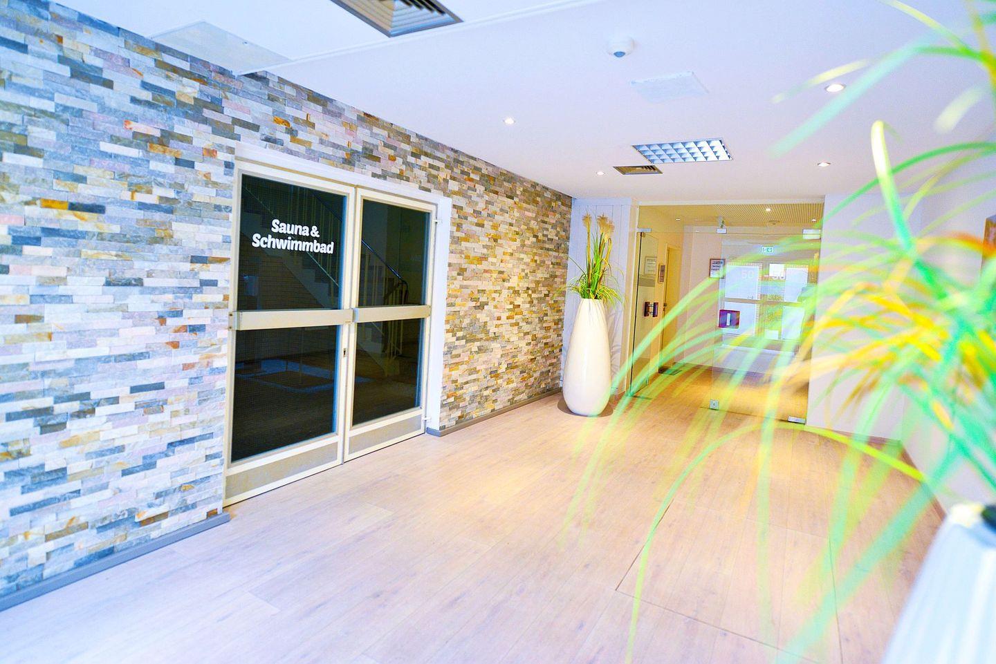Der Wellnessbereich befindet sich in unmittelbarer Nähe und auf derselben Ebene wie die Wohnung. Hier erwartet Sie ein 29 °C warmes Schwimmbad mit Gegenstromanlage, eine großzügige Sauna, ein Dampfbad und ein Ruheraum mit Zugang zum Außenhof. Zusätzlich steht Ihnen eine kostenfreie Wärmekabine in der Wohnung für noch mehr Wohlfühlmomente zur Verfügung.