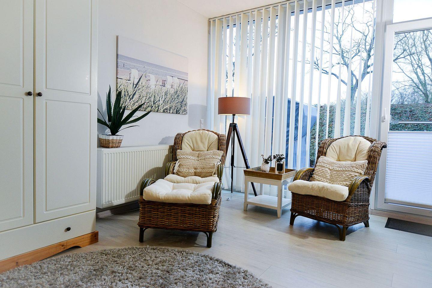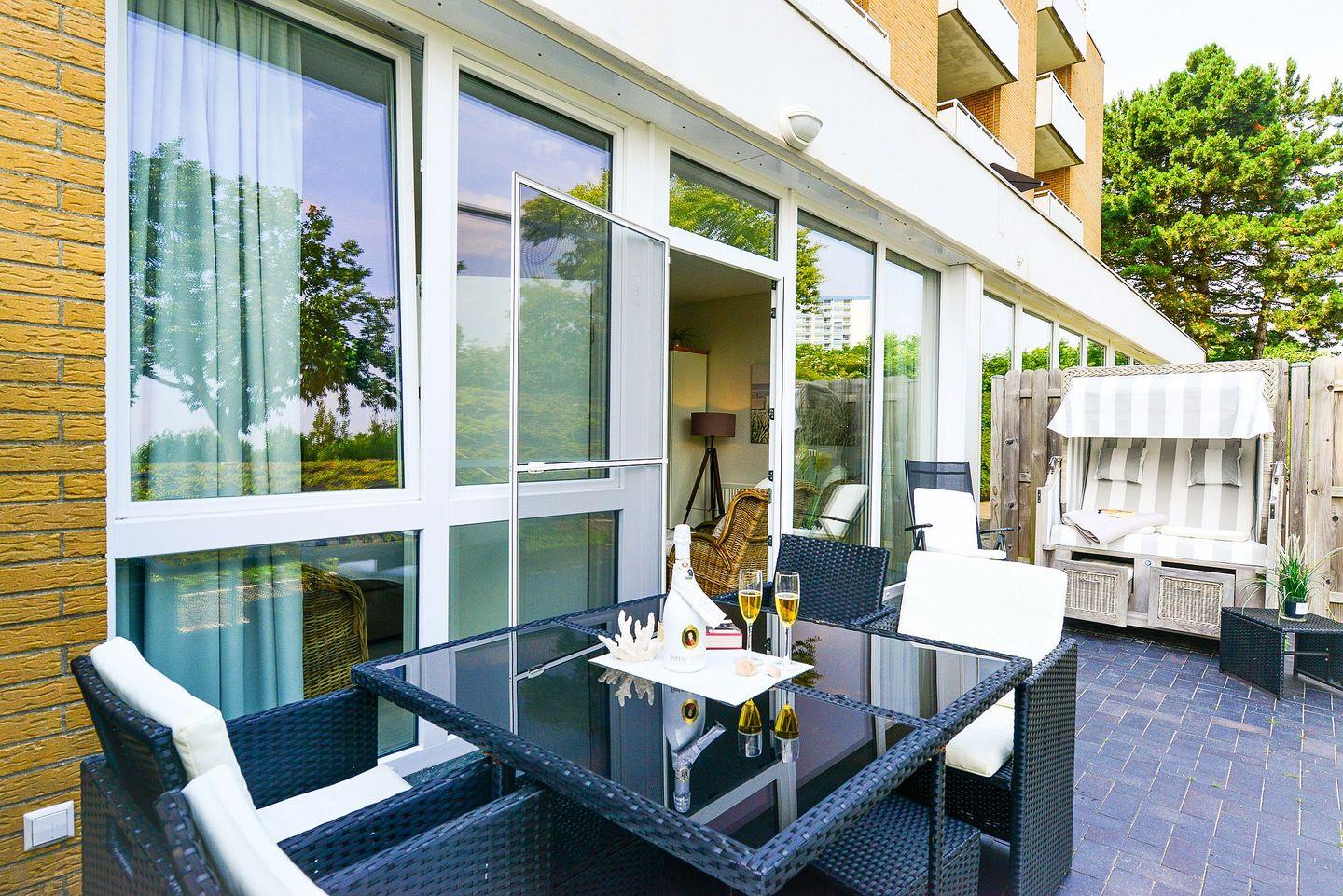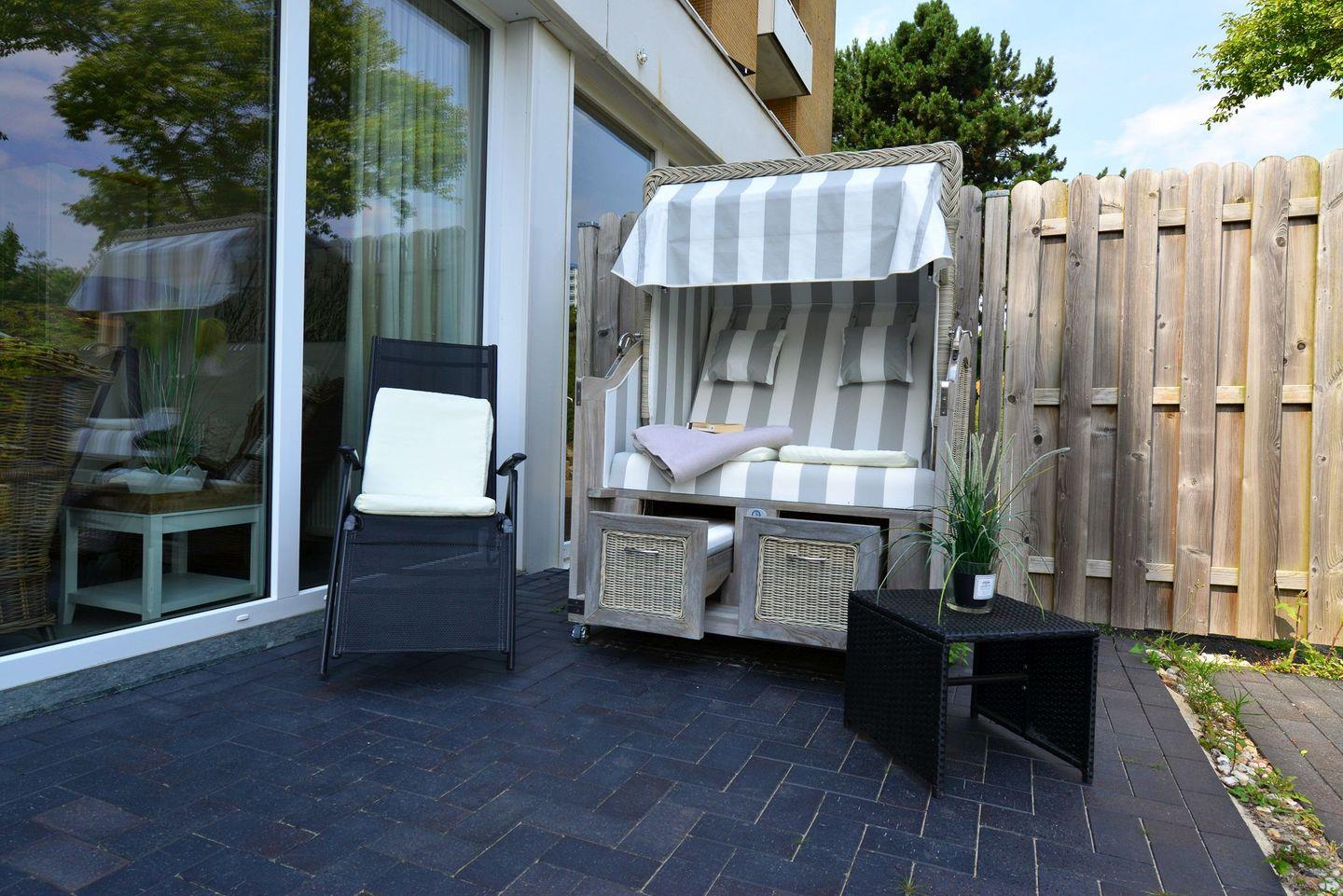 Gemütliche 71m² Ferienwohnung in Cuxhaven mit Terrasse, Strandkorb und eigenem Wellnessbereich für entspannte Nordseeferien.