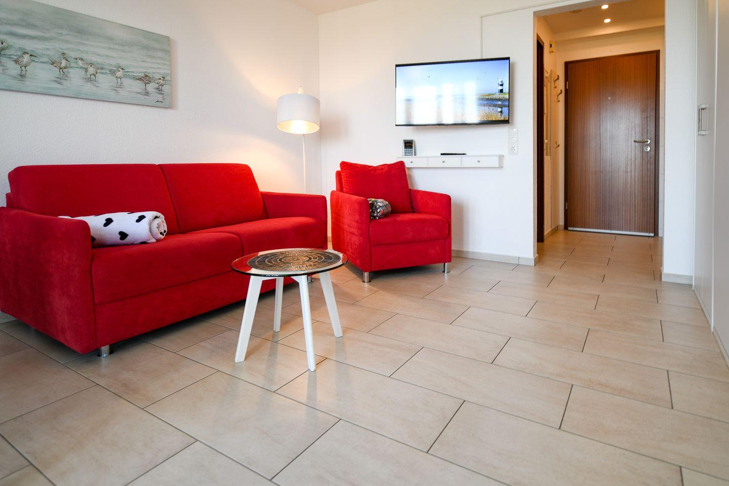 Möblierte 23?m²-Ferienwohnung im 2. OG an der Promenade mit direkter Seesicht und verglastem Westbalkon. Ideal für 2 Personen. Der Aufzug im Eingang 7a fährt bis ins 3. OG, die Wohnung erreicht man über den Außenbalkon und das Treppenhaus in Eingang 7 oder 7b. Moderne Ausstattung mit Küchenzeile, Geschirrspüler, Fußbodenheizung, WLAN, Parkplatz. Hunde erlaubt. Ruhige Lage nahe Strand und Wattenmeer.