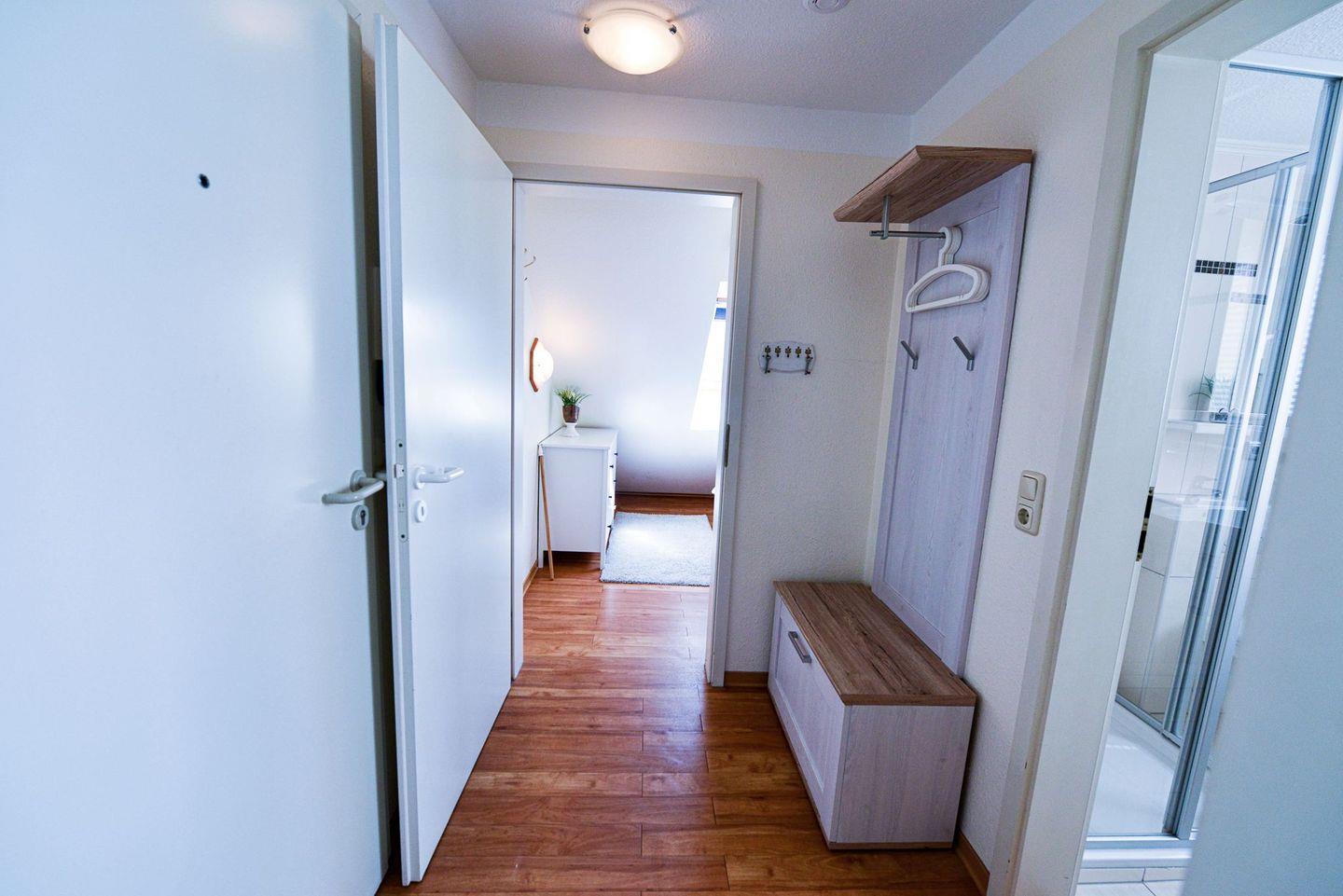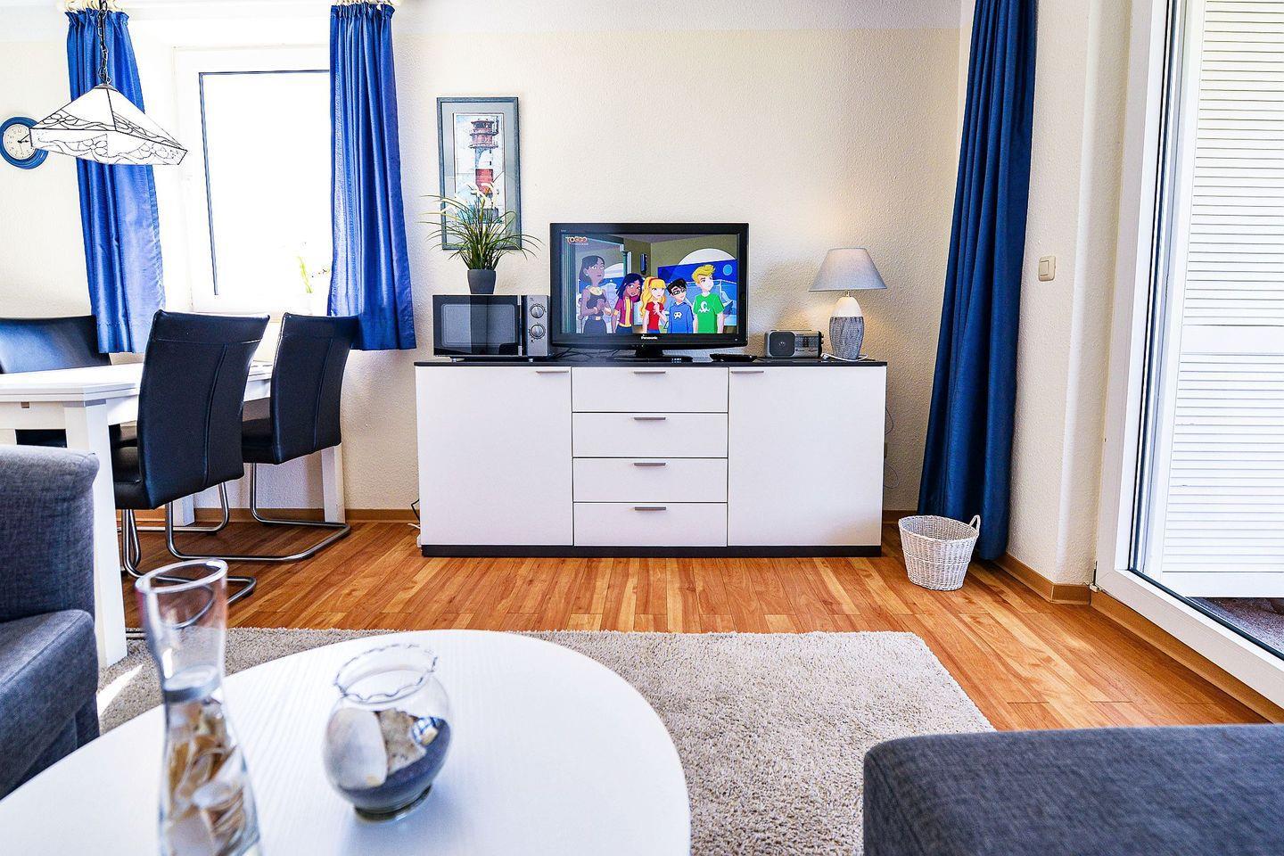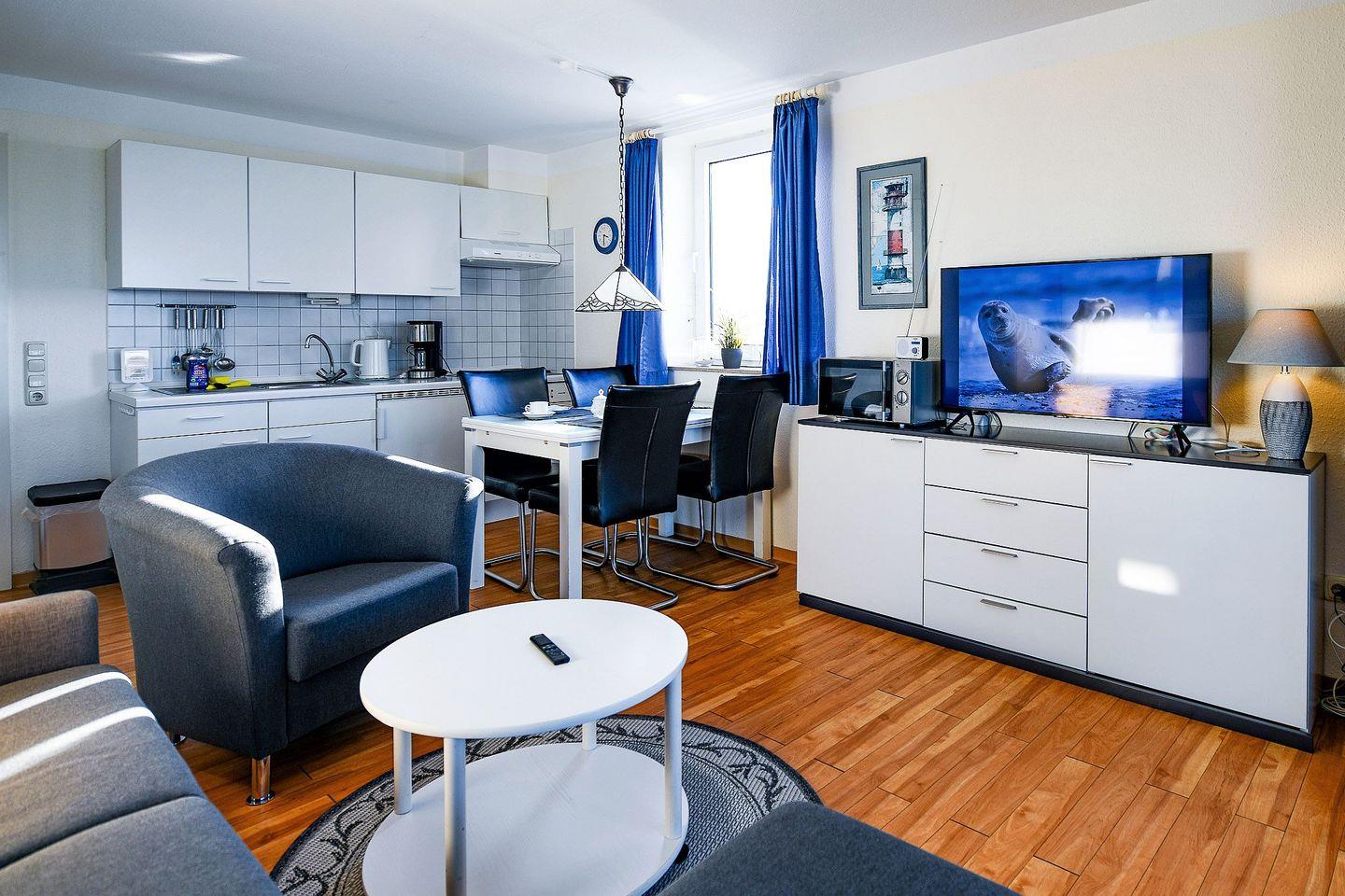 Die modern ausgestattete Ferienwohnung verfügt über eine praktische Küchenzeile, ein helles Tageslichtbad mit Dusche und WC, ein Schlafzimmer sowie einen gemütlichen Wohnbereich mit Flatscreen-TV und Schlafsofa. An kühleren Tagen sorgt die Fußbodenheizung für Wohlfühlatmosphäre. Kostenloses WLAN und ein eigener Stellplatz (Nr.?10) direkt am Haus sind inklusive.
