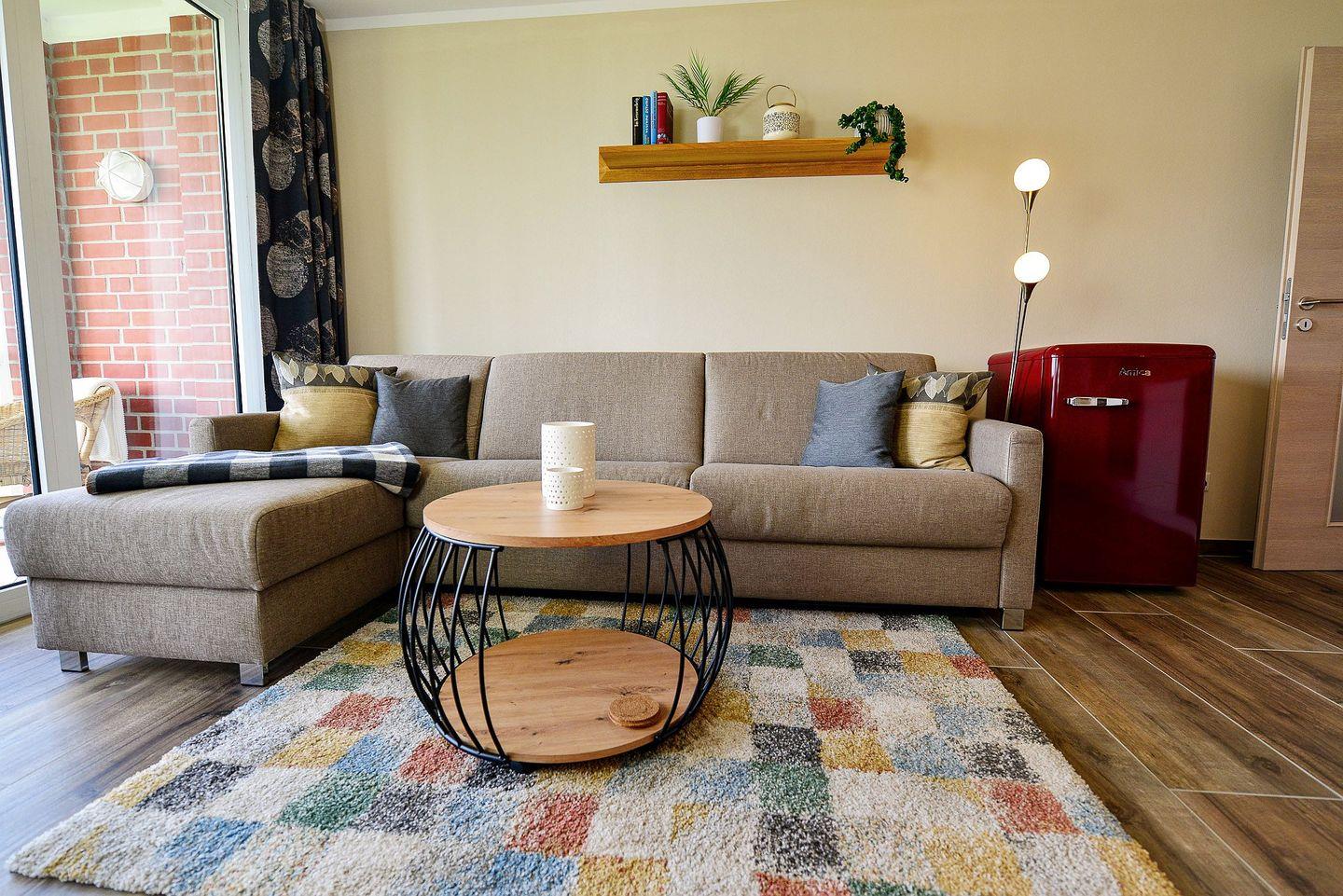 Die Wohnung verfügt über ein separates Schlafzimmer mit Doppelbett sowie ein Schlafsofa im Wohnbereich. Die Küche ist voll ausgestattet mit Herd, Backofen, Kühlschrank und Kaffeemaschine. WLAN, Flatscreen-TV, Fußbodenheizung und ein neues und modernes Duschbad sorgen für Komfort.