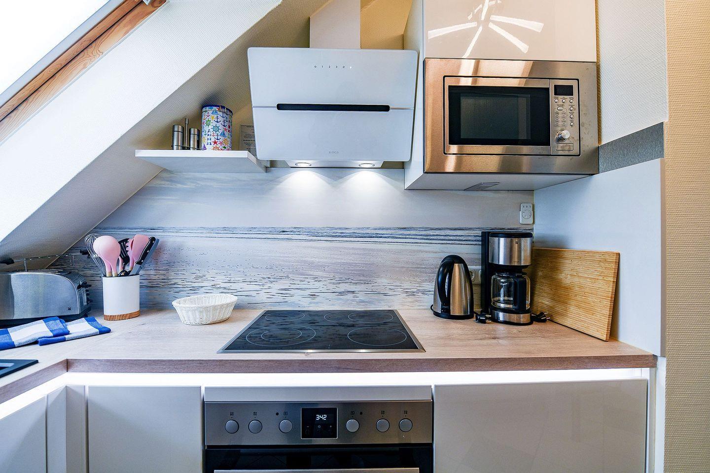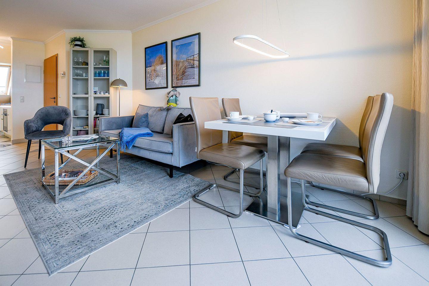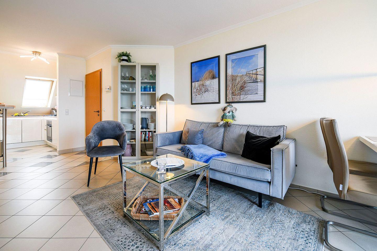 Modern eingerichtet mit offener, voll ausgestatteter Küchenzeile (inkl. Senseo-Maschine), stilvollem Essbereich und zwei Flatscreen-TVs. Kostenloses WLAN und eine durchdachte Raumaufteilung sorgen für Komfort – auch an ruhigen Tagen. Der große Balkon bietet traumhafte Sonnenuntergänge über der Nordsee. Die Wohnung ist über eine Treppe gut zugänglich