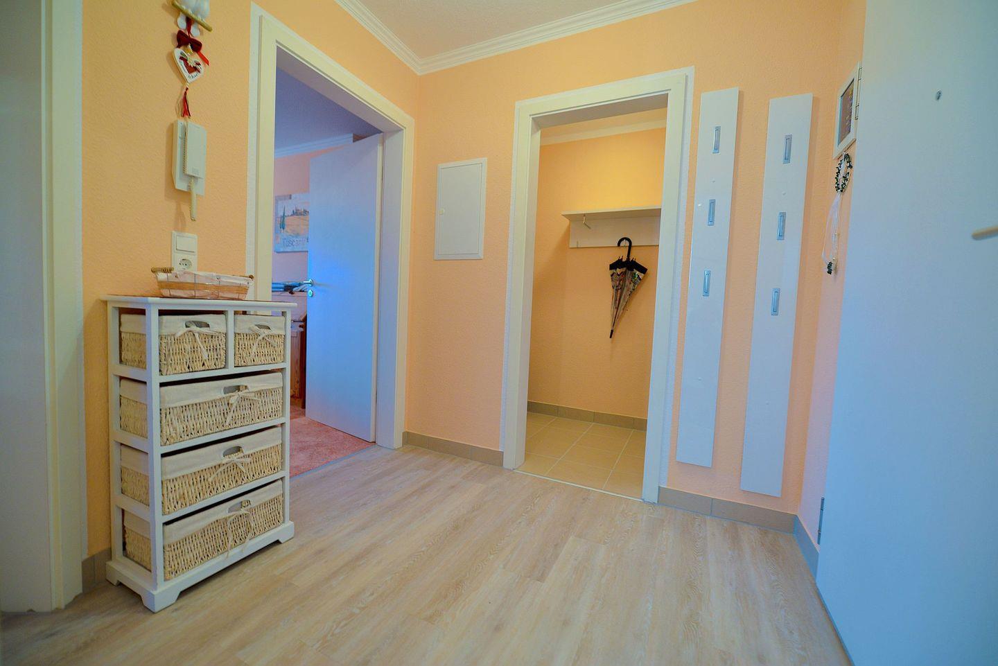 Die geräumige und 69m² große Ferienwohnung überzeugt mit hochwertiger Einrichtung und angenehmem Ambiente. Lassen Sie in den gemütlichen Räumlichkeiten die Seele baumeln und spannen Sie ganz gemütlich aus vom Alltag. Besondere Stunden lassen sich auf dem überdachten Balkon in der 5. Etage verbringen, der Ihnen einen seitlichen Blick aufs Meer bietet und sich hervorragend dazu eignet lange Strandtage ganz gemütlich ausklingen zu lassen.