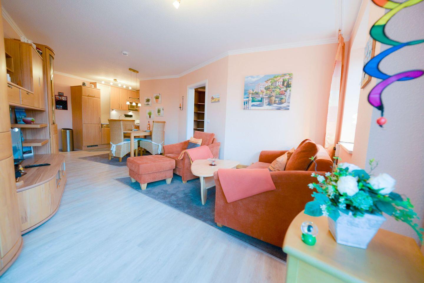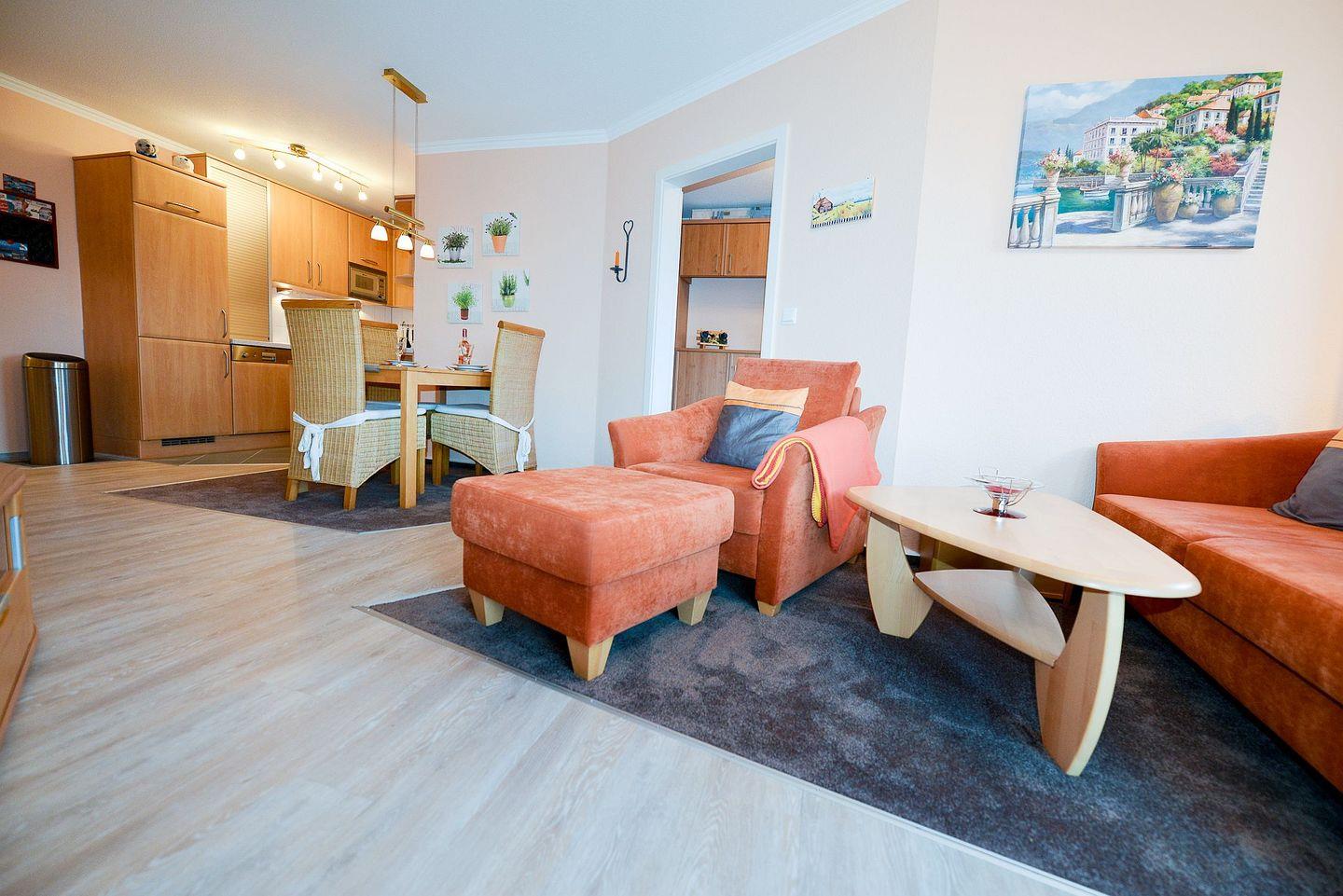 Die geräumige und 69m² große Ferienwohnung überzeugt mit hochwertiger Einrichtung und angenehmem Ambiente. Lassen Sie in den gemütlichen Räumlichkeiten die Seele baumeln und spannen Sie ganz gemütlich aus vom Alltag.
