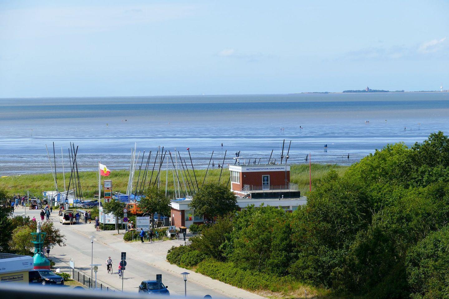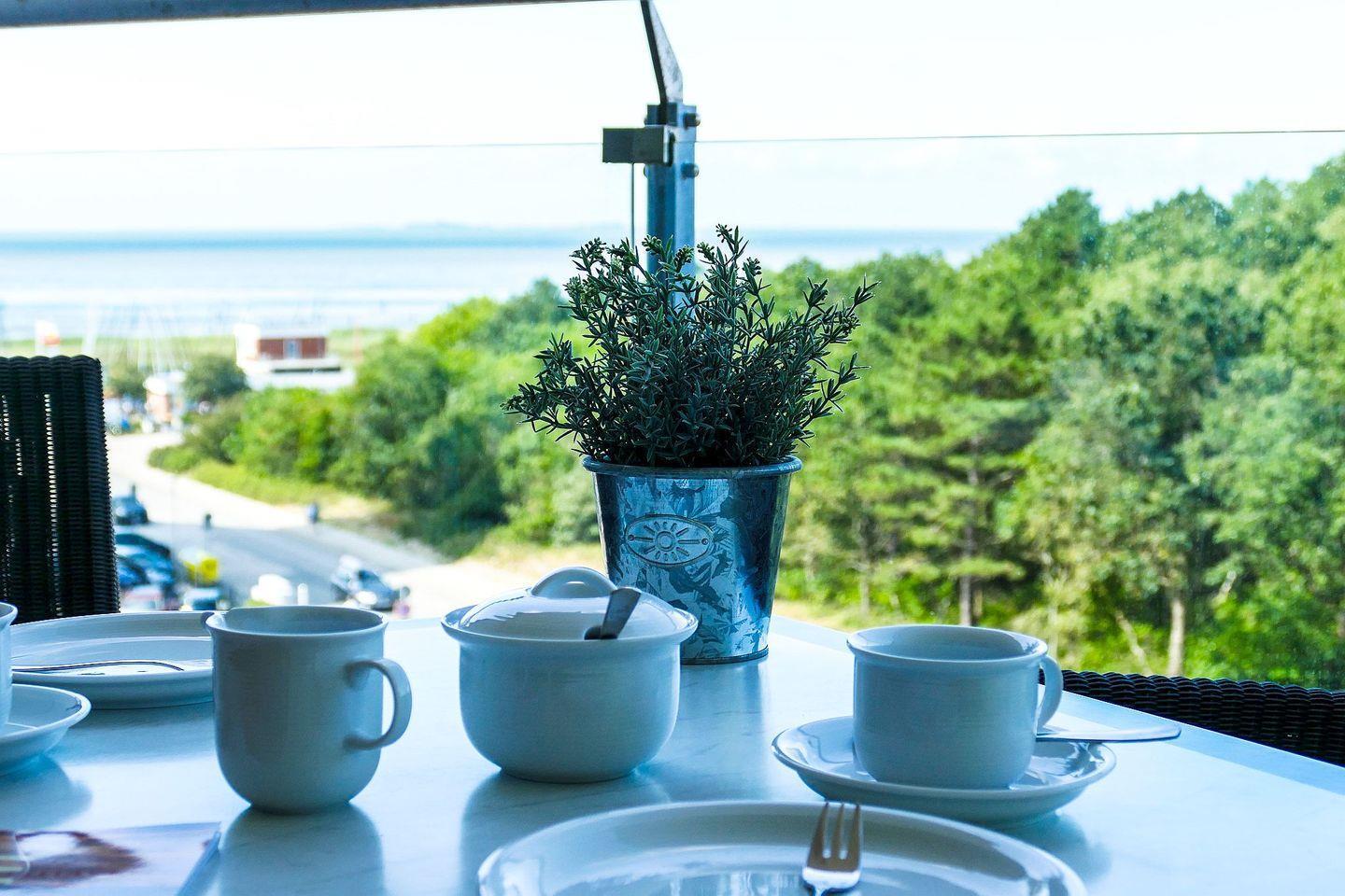 Moderne Ferienwohnung in Cuxhaven mit direktem Meerblick und zwei überdachten Balkonen.