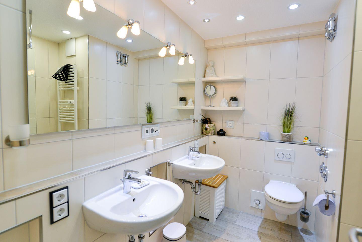 Das großzügige Bad verfügt über zwei Waschbecken und eine ebenerdige Dusche – elegant und funktional zugleich. Für gemütliche Abende sorgen ein großer 60-Zoll-TV im Wohnbereich sowie ein weiterer Fernseher im Schlafzimmer.