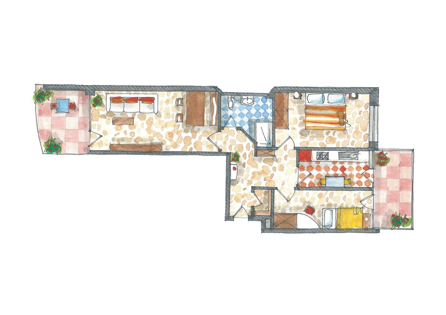 Es gibt 1 Schlafraum mit einem Doppelbett, 1 Schlafraum mit zwei Einzelbetten (0,80mx2m) und 1 Wohnraum mit direkter Seesicht. Es steht Ihnen eine separate Küche mit Geschirrspüler, Mikrowelle und Backofen zur Verfügung. Außerdem haben Sie eine Dusche/WC, TV, Radio, und 2 Balkone (einmal Seeseite und einmal Südseite). W-lan kostenlos. Es sind keine Tiere erlaubt.