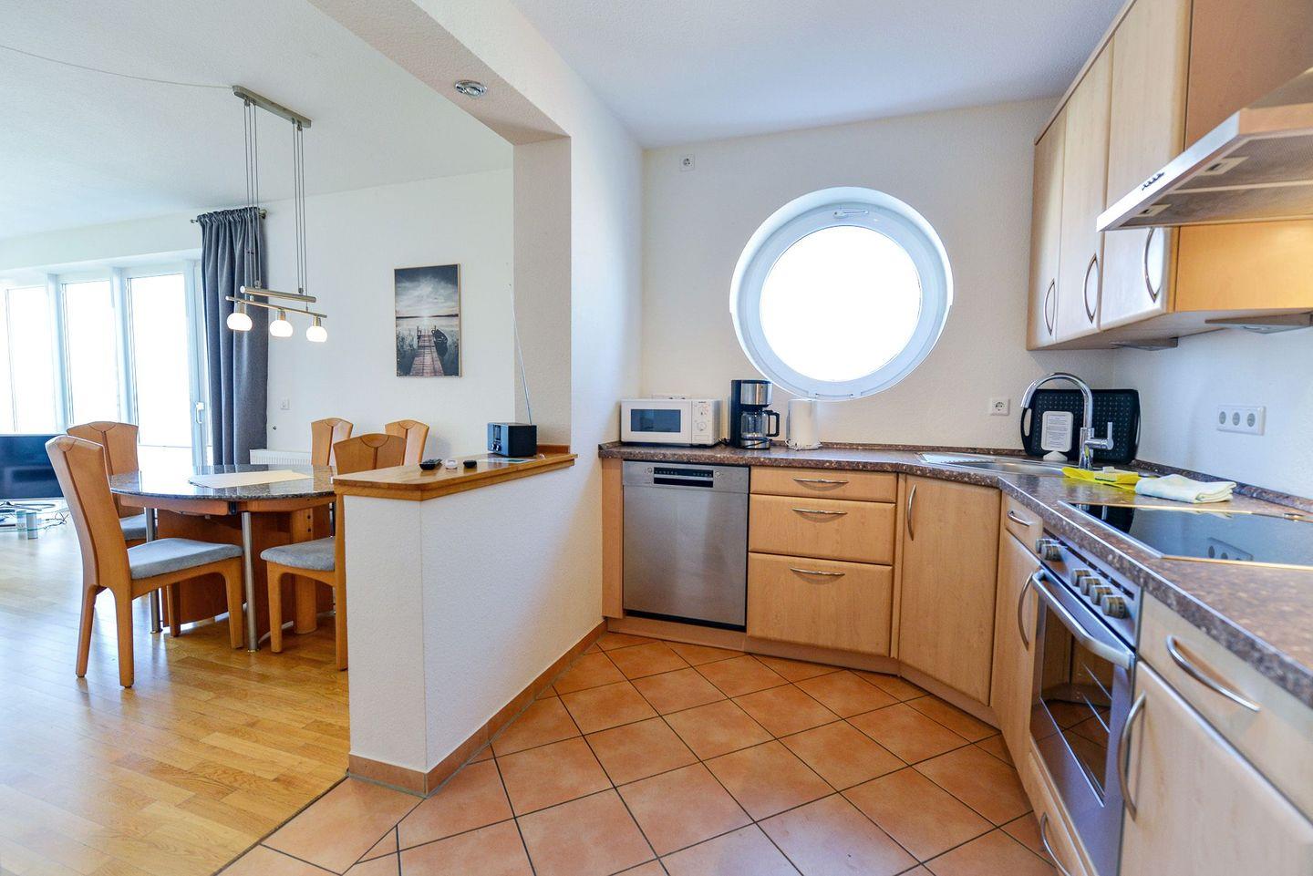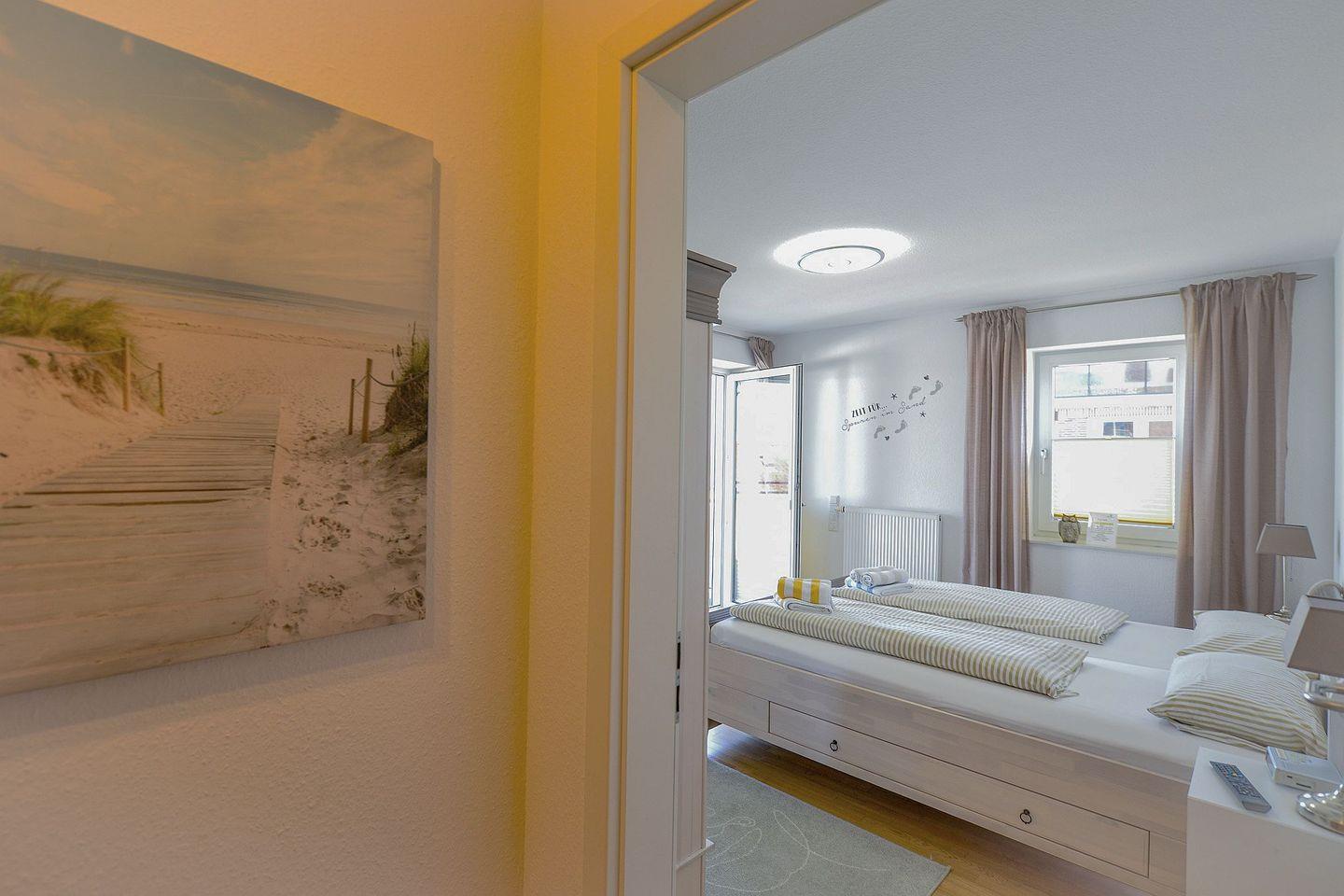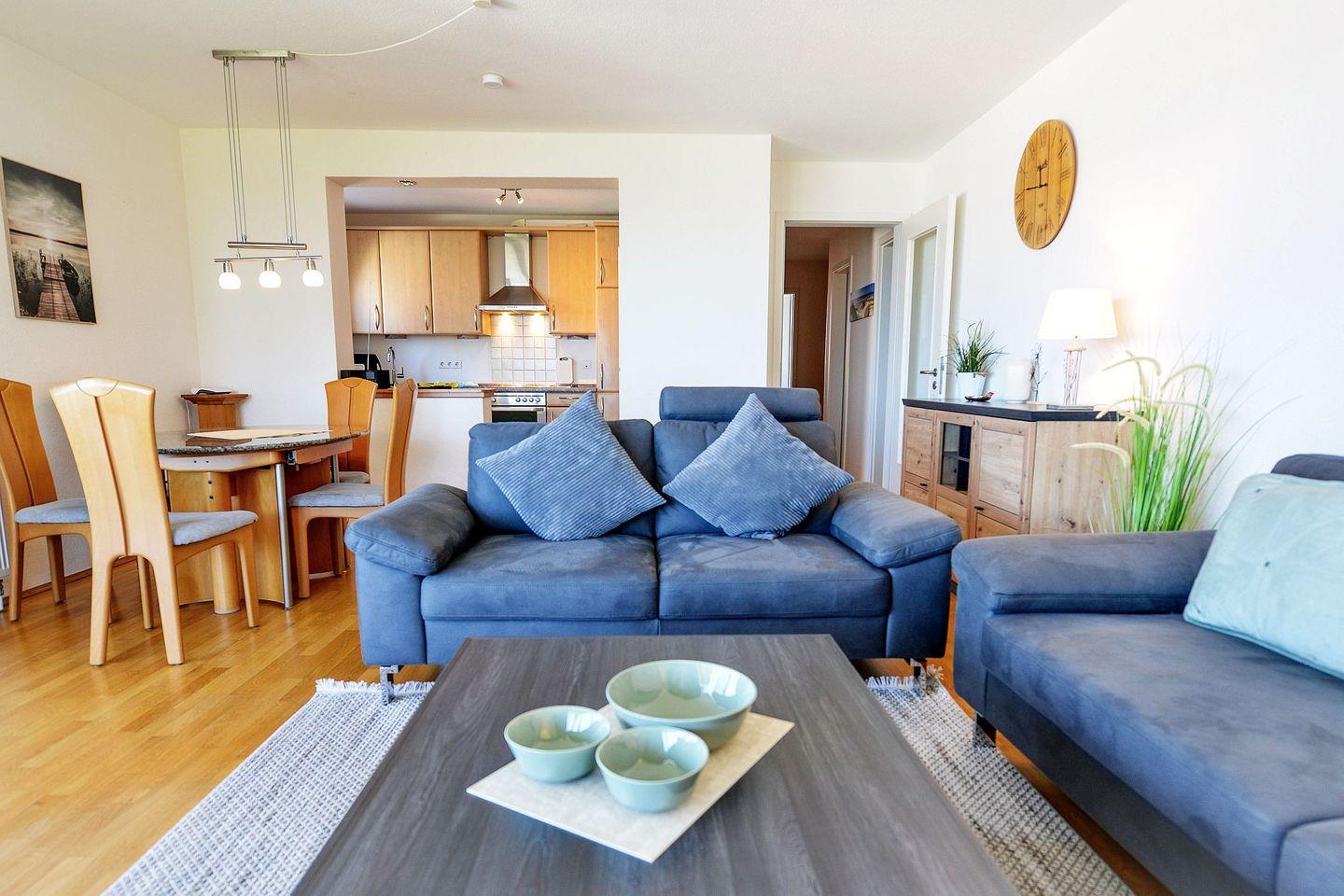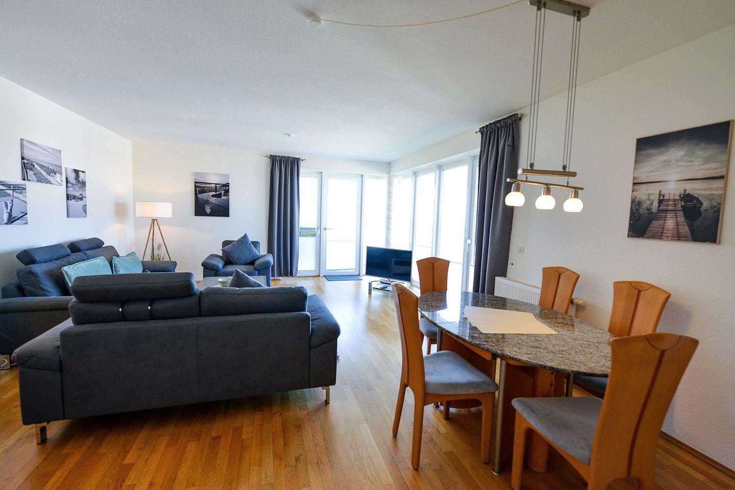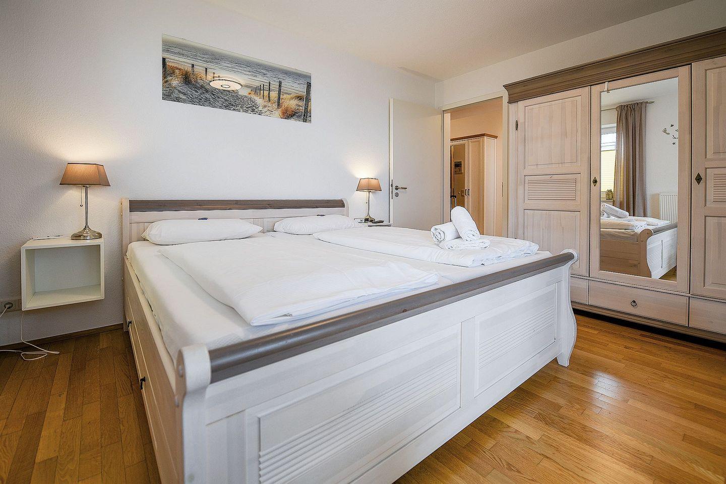 Zwei möblierte Balkone mit Ausrichtung zur See laden zum Verweilen ein. Die Ferienwohnung verfügt über zwei separate Schlafzimmer, ein großzügiges Bad mit Dusche und Badewanne, ein zusätzliches Gäste-WC sowie eine voll ausgestattete Küche mit Spülmaschine. Drei Flatscreen-TVs, kostenloses WLAN und eine eigene Miele-Waschmaschine sorgen für modernen Komfort. Ein eigener Tiefgaragenstellplatz mit direktem Zugang ins Haus ist ebenfalls vorhanden. Ein persönlicher Strandkorb am Strand steht Ihnen saisonal kostenfrei zur Verfügung.