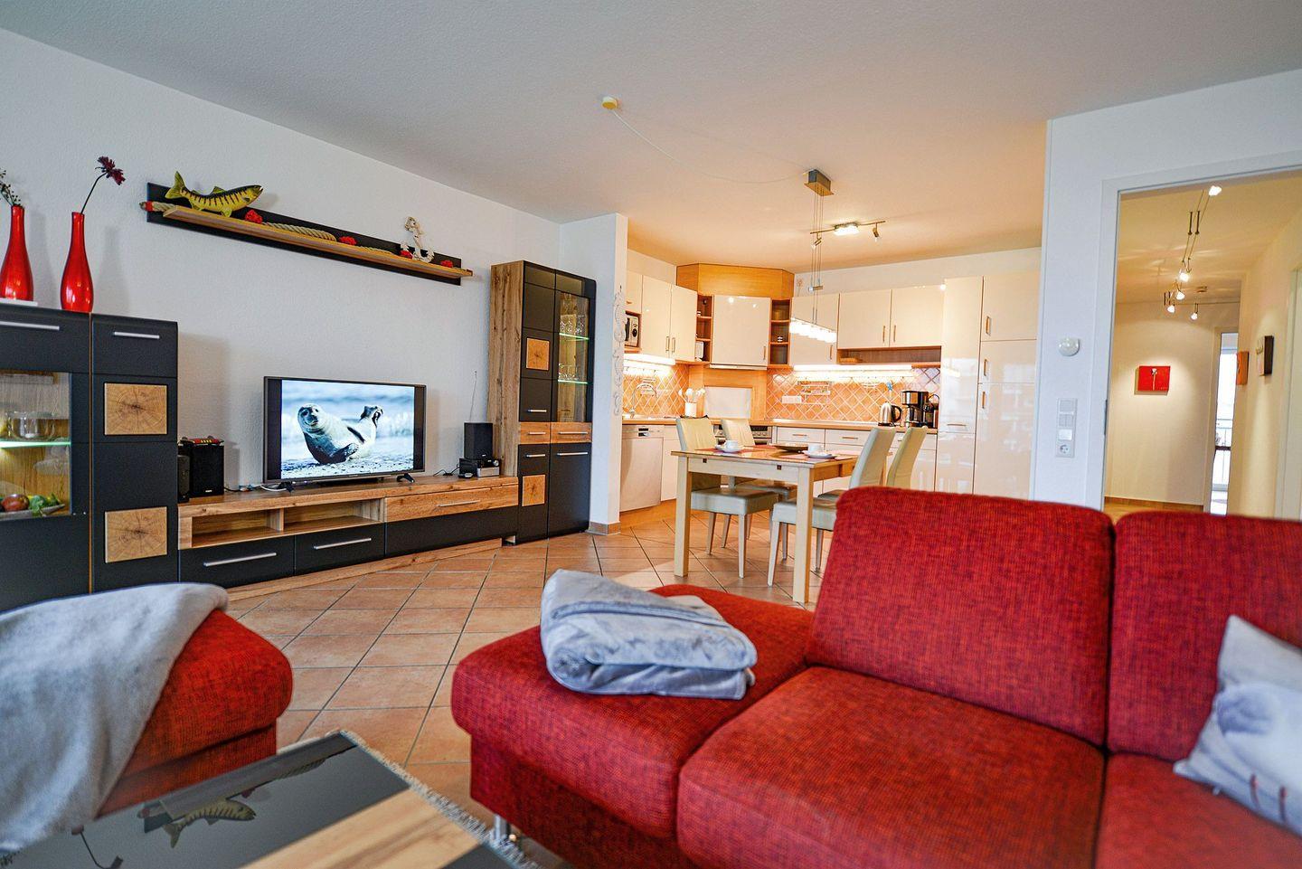 Vom lichtdurchfluteten Wohnbereich sowie von beiden überdachten Balkonen genießen Sie einen traumhaften Blick auf die Nordsee. Zwei moderne Bäder – eines mit Dusche, eines mit Badewanne – sorgen für Komfort und Erholung. Die voll ausgestattete Küchenzeile bietet alles für genussvolle Urlaubstage. Zwei separate Schlafzimmer, Flatscreen-TVs, kostenloses WLAN und eine eigene Waschmaschine runden das Wohlfühlambiente ab.