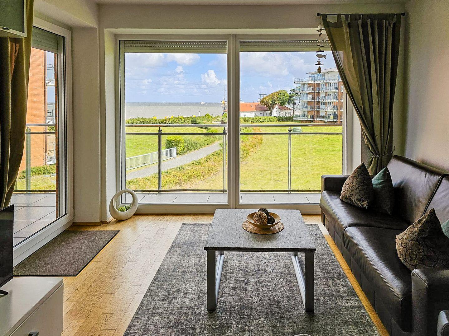 Helle Ferienwohnung im Strandpalais Cuxhaven mit direktem Meerblick und großem Balkon.