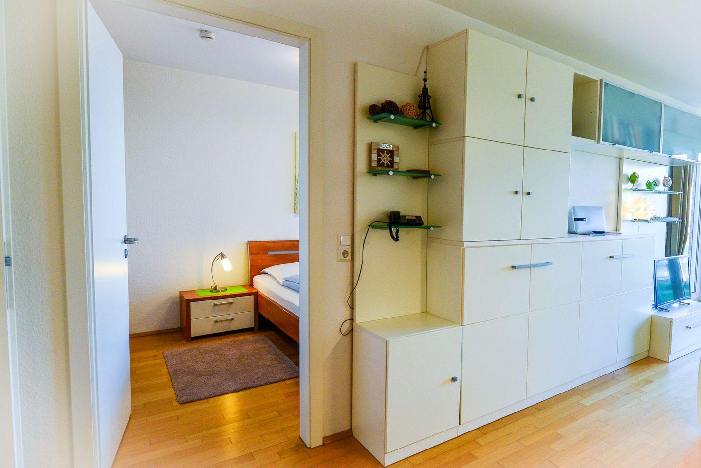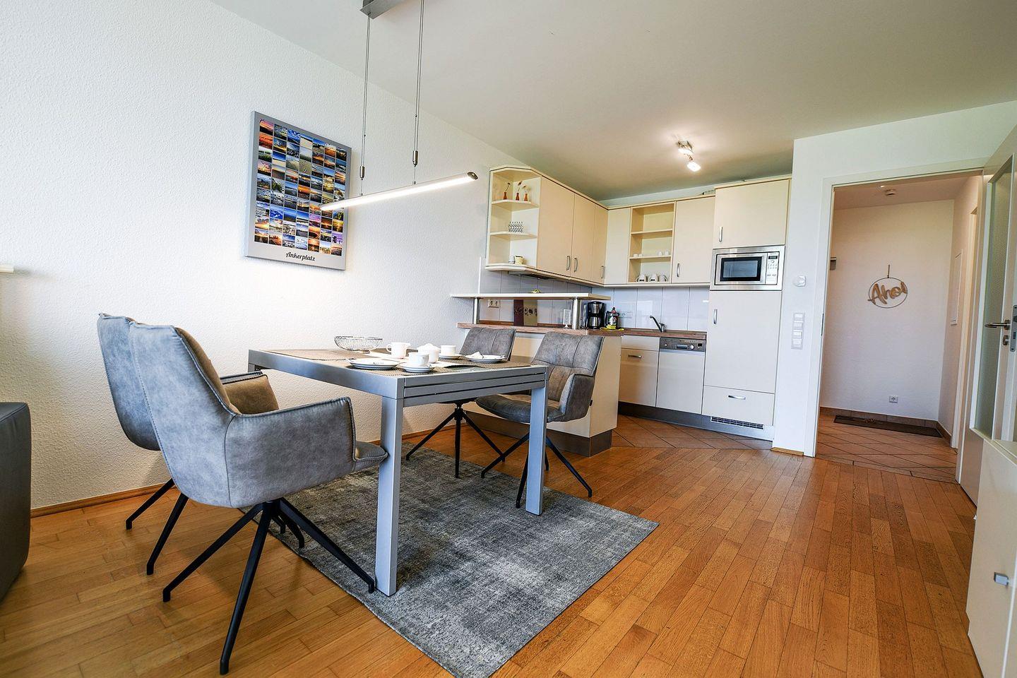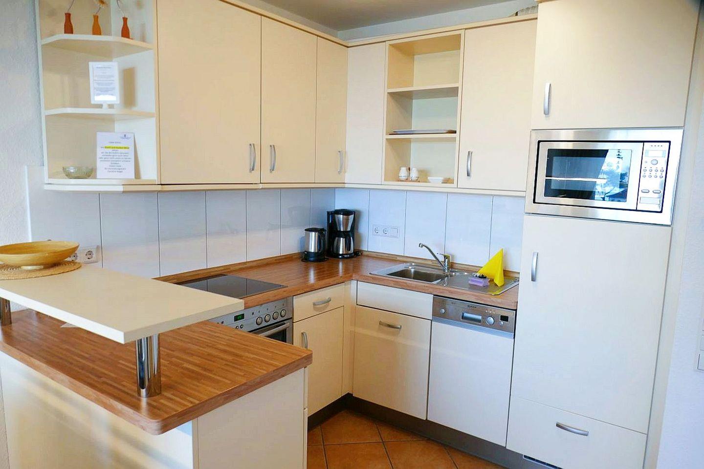 Die voll ausgestattete Küchenzeile ist ideal für Selbstversorger. Ein eigener Tiefgaragenstellplatz steht Ihnen kostenfrei zur Verfügung – mit bequemem Zugang ins Haus per Aufzug; von dort erreichen Sie die Wohnung ohne Stufen über den Flur. Haustiere sind nicht erlaubt. Das Ahoi! Thalassozentrum, die Strandpromenade, Restaurants und Einkaufsmöglichkeiten sind in 1 Minute erreichbar.