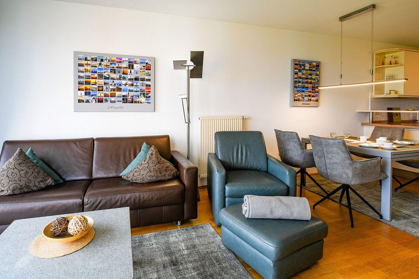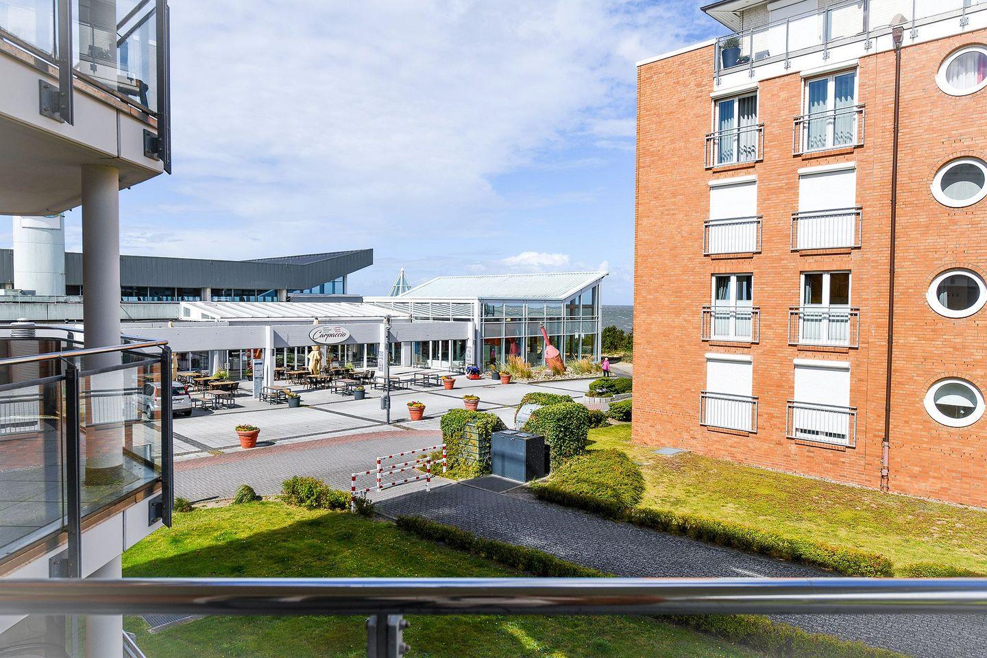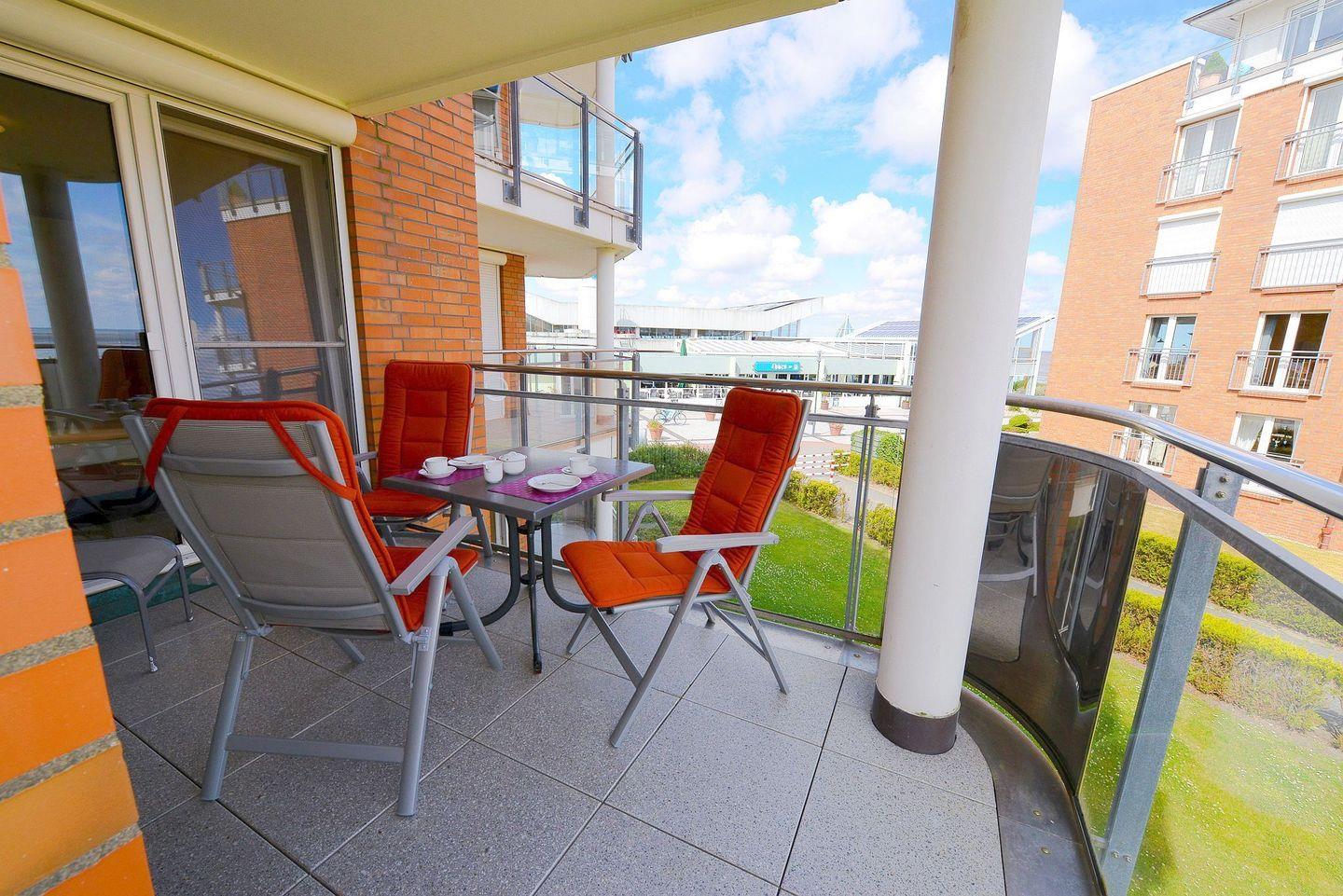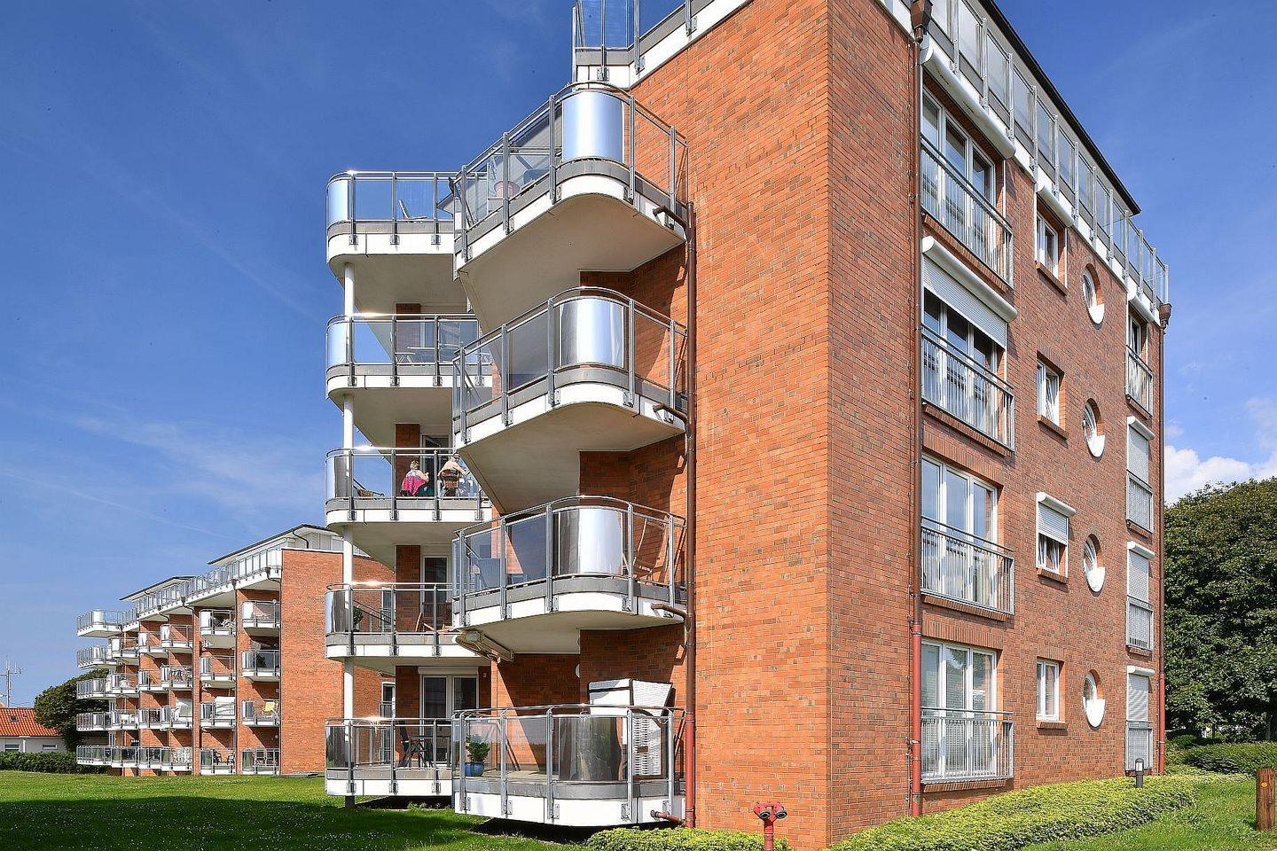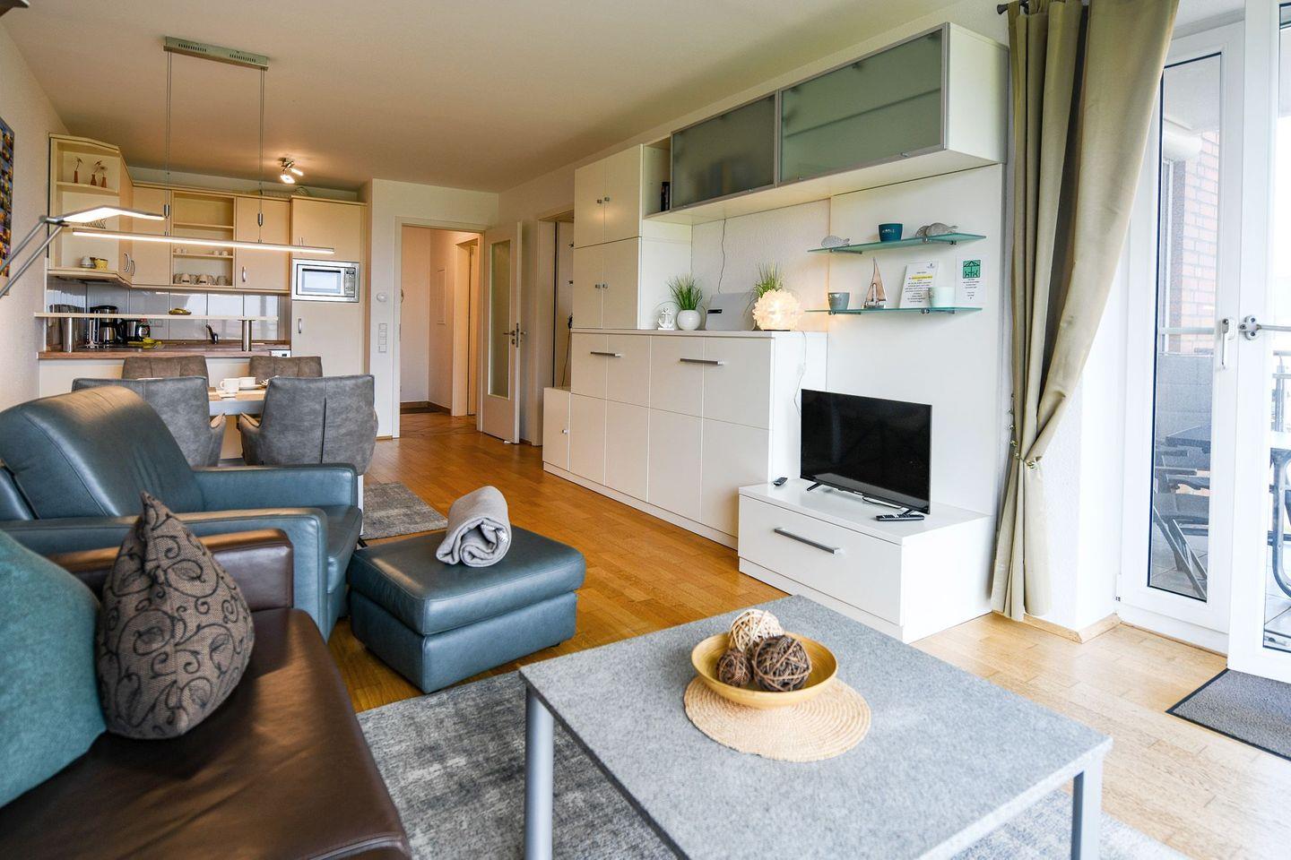 Die ca. 60?m² große, helle Ferienwohnung mit direktem Meerblick bietet ein stilvolles Ambiente und eine hochwertige Ausstattung. Eine voll ausgestattete Küchenzeile, ein modernes Duschbad, ein separates Schlafzimmer sowie ein Einzelschrankbett im Wohnraum sorgen für Komfort. Der große, überdachte Balkon mit Blick auf die Nordsee lädt zum Verweilen ein. WLAN, Flatscreen-TV, Festnetztelefon und ein Tiefgaragenstellplatz sind inklusive.