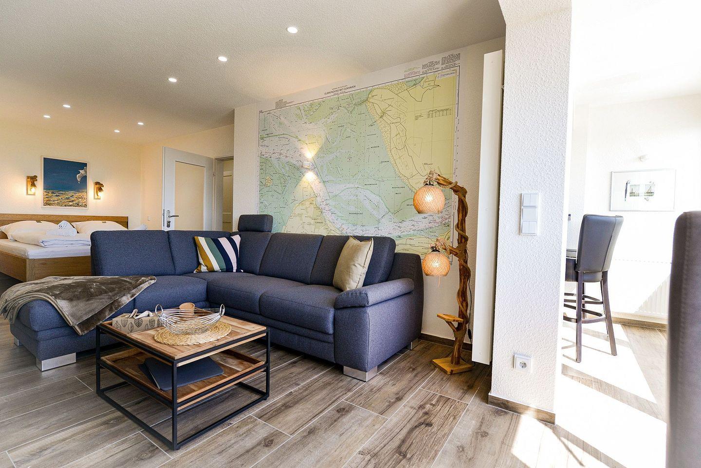 Moderne Ferienwohnung mit Seeblick direkt am Strand von Cuxhaven, ideal für einen entspannten Nordseeurlaub.