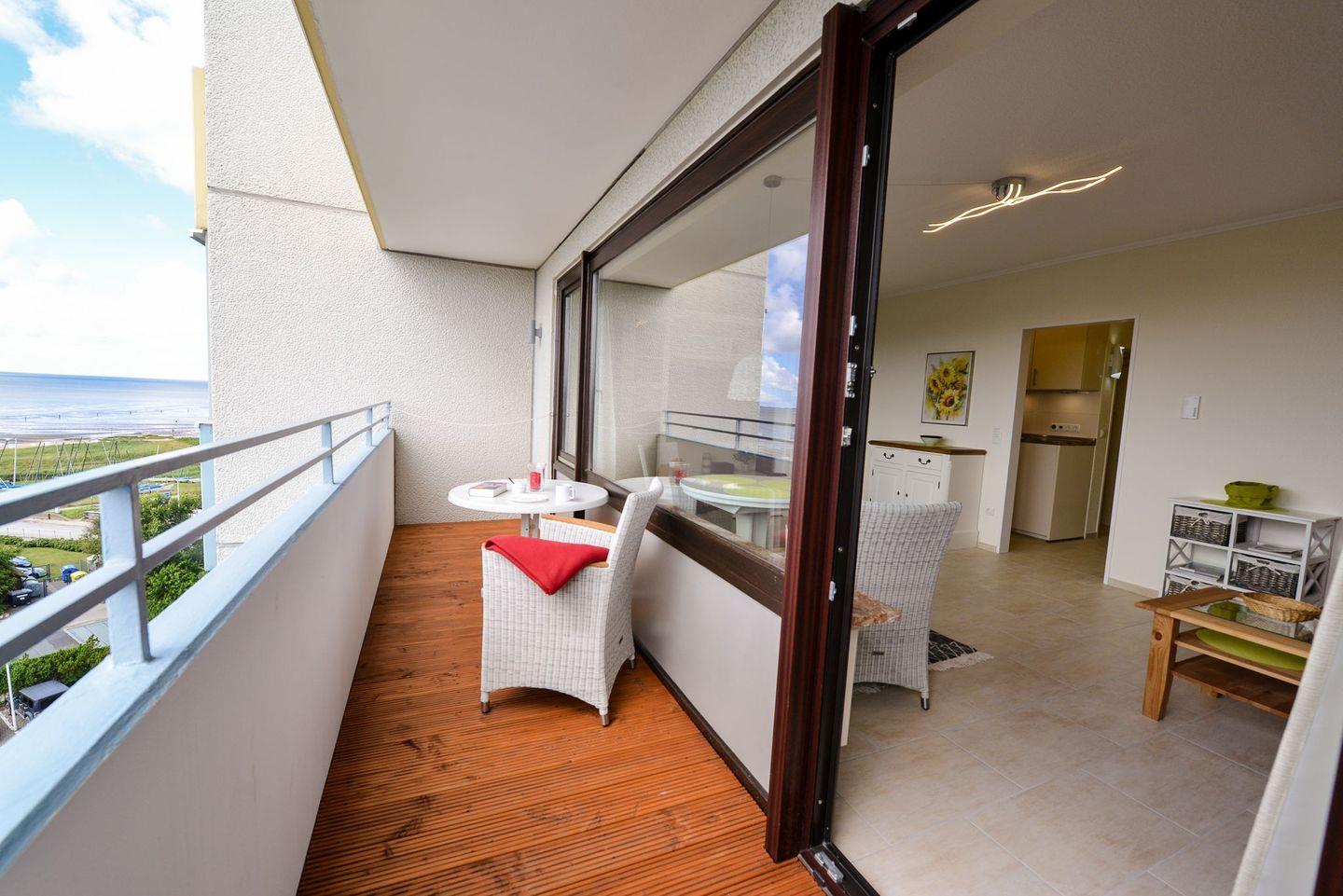 Moderne Ferienwohnung in Cuxhaven mit Panoramablick aufs Meer und Schwimmbad, Sauna sowie überdachtem Westbalkon für entspannte Urlaubstage.