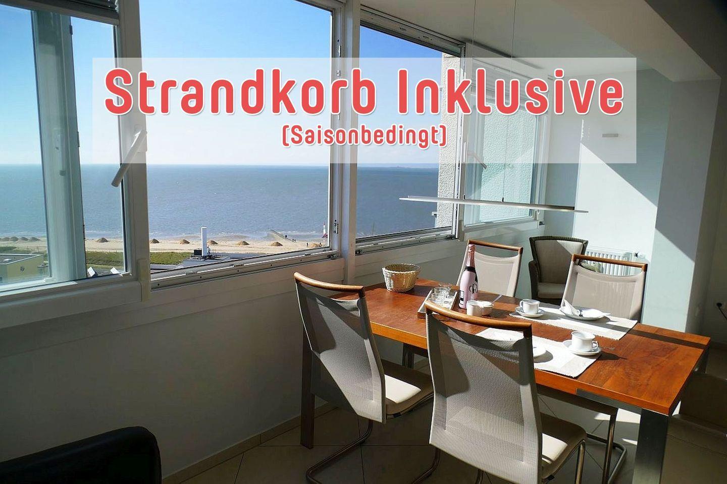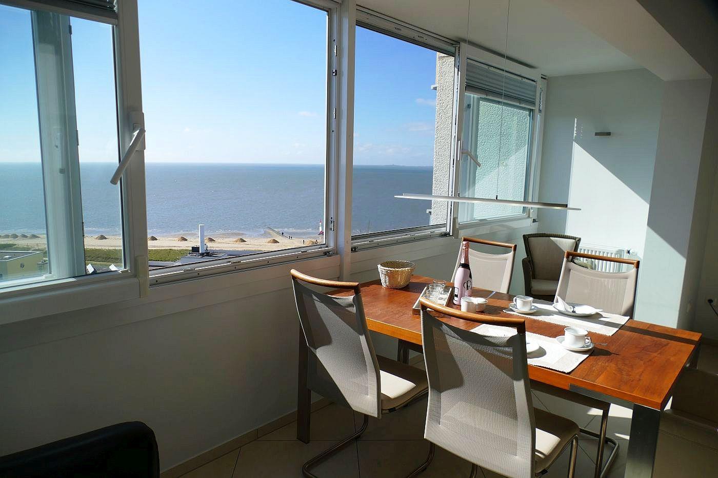 Moderne Ferienwohnung in 11. Etage mit Panoramablick aufs Meer und eigenem Strandkorb in Cuxhaven.