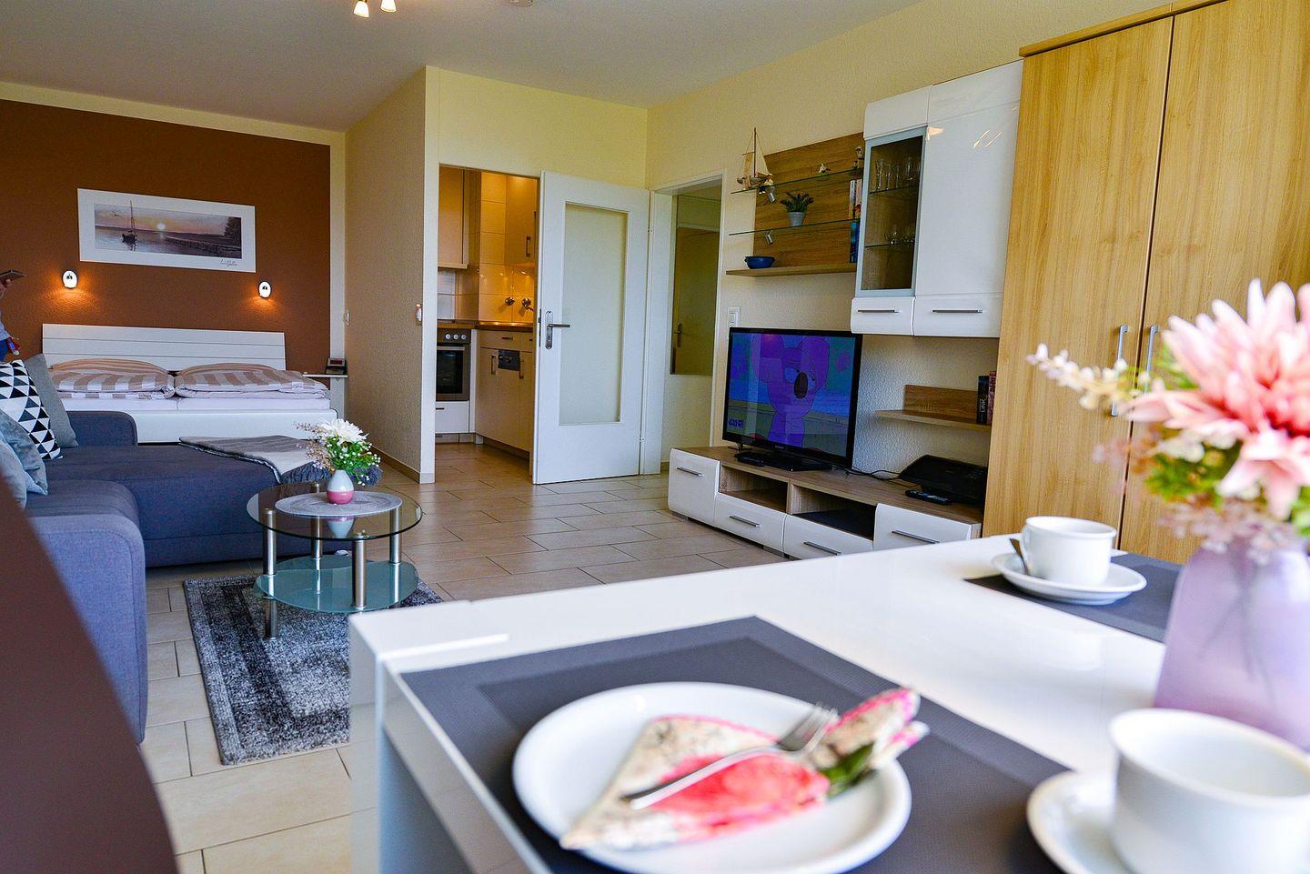 Die charmante Ferienwohnung erstreckt sich über großzügige 50m² und bietet Platz für bis zu 3 Personen. Sie verfügt über ein Schlafzimmer mit einem komfortablen Bett (140x200) sowie eine gemütliche Nische im Wohnraum mit einem weiteren Doppelbett.