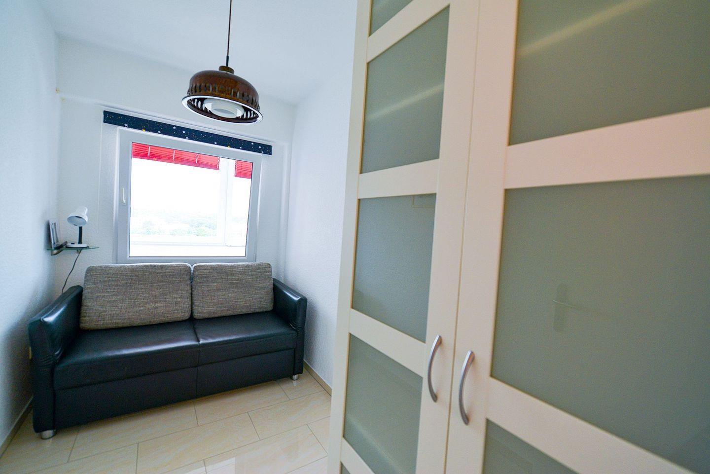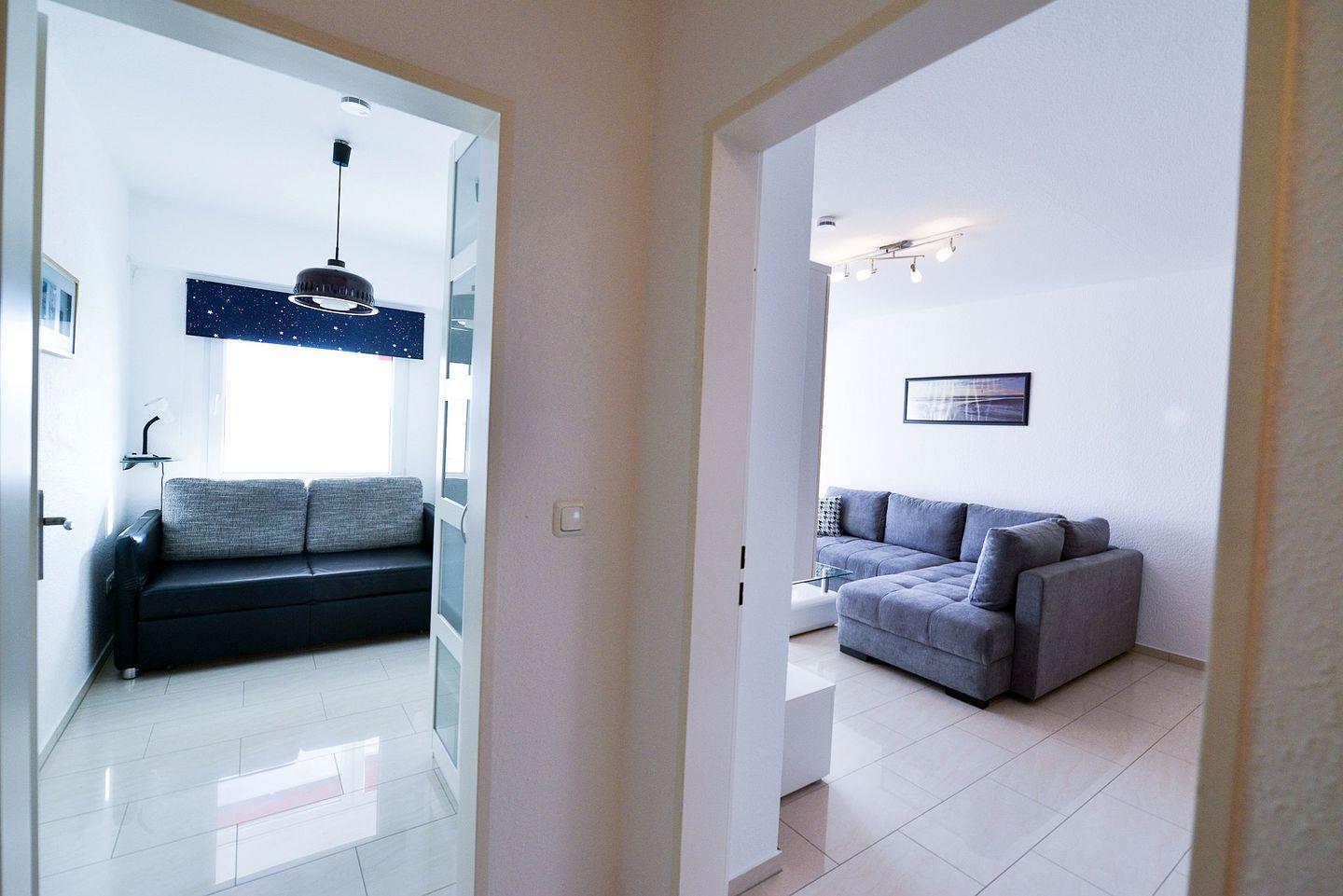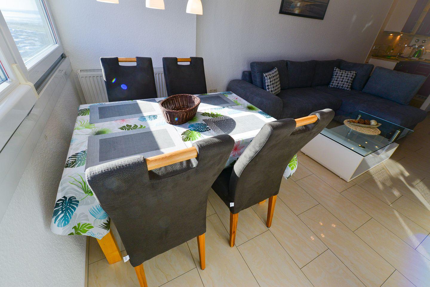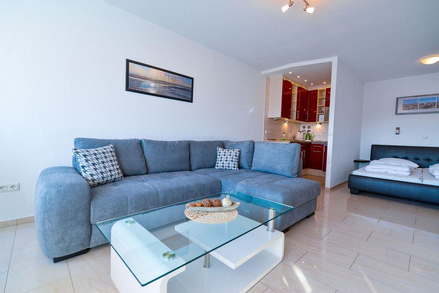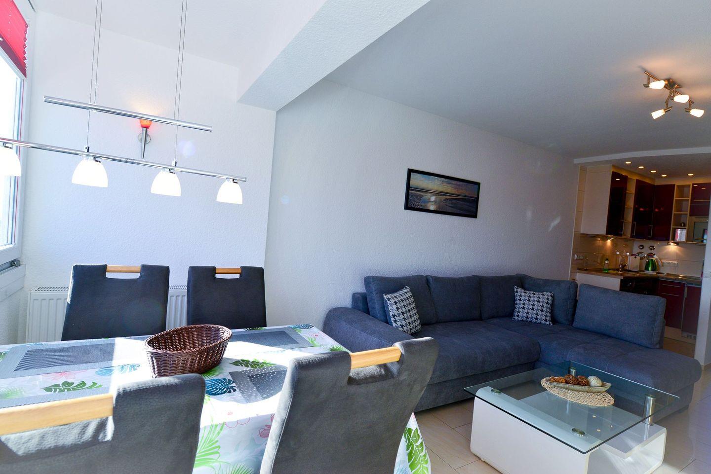 Sie ist für bis zu 4 Personen geeignet und verfügt über eine offene, voll ausgestattete Küche mit Essbereich, ein modernes Bad mit Regendusche, ein separates Schlafzimmer sowie einen Wohnbereich mit Schlafgelegenheit. Die verglaste Südfensterfront zum Öffnen sorgt für viel Licht. Zwei Flatscreen-TVs und kostenfreies WLAN stehen zur Verfügung. Im Haus befinden sich ein Schwimmbad, zwei Saunen und ein Ruheraum (Sauna gegen Gebühr). Ein Aufzug bringt Sie direkt zur Wohnung, ein kostenfreier Parkplatz ist im Preis enthalten. In fußläufiger Entfernung erreichen Sie Bäcker, Gastronomie und Einkaufsmöglichkeiten (saisonal unterschiedlich).