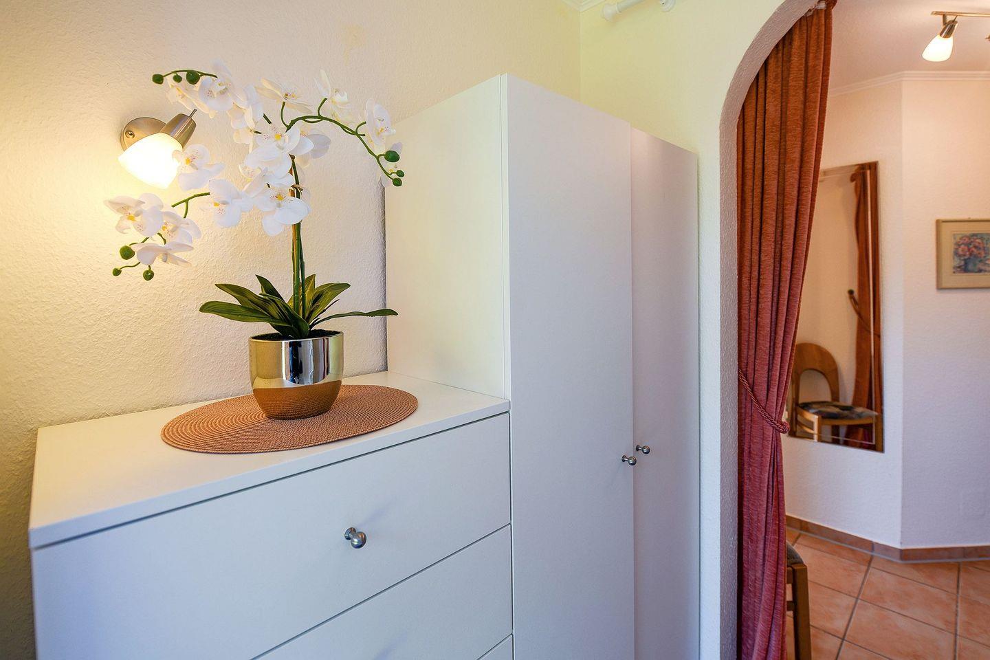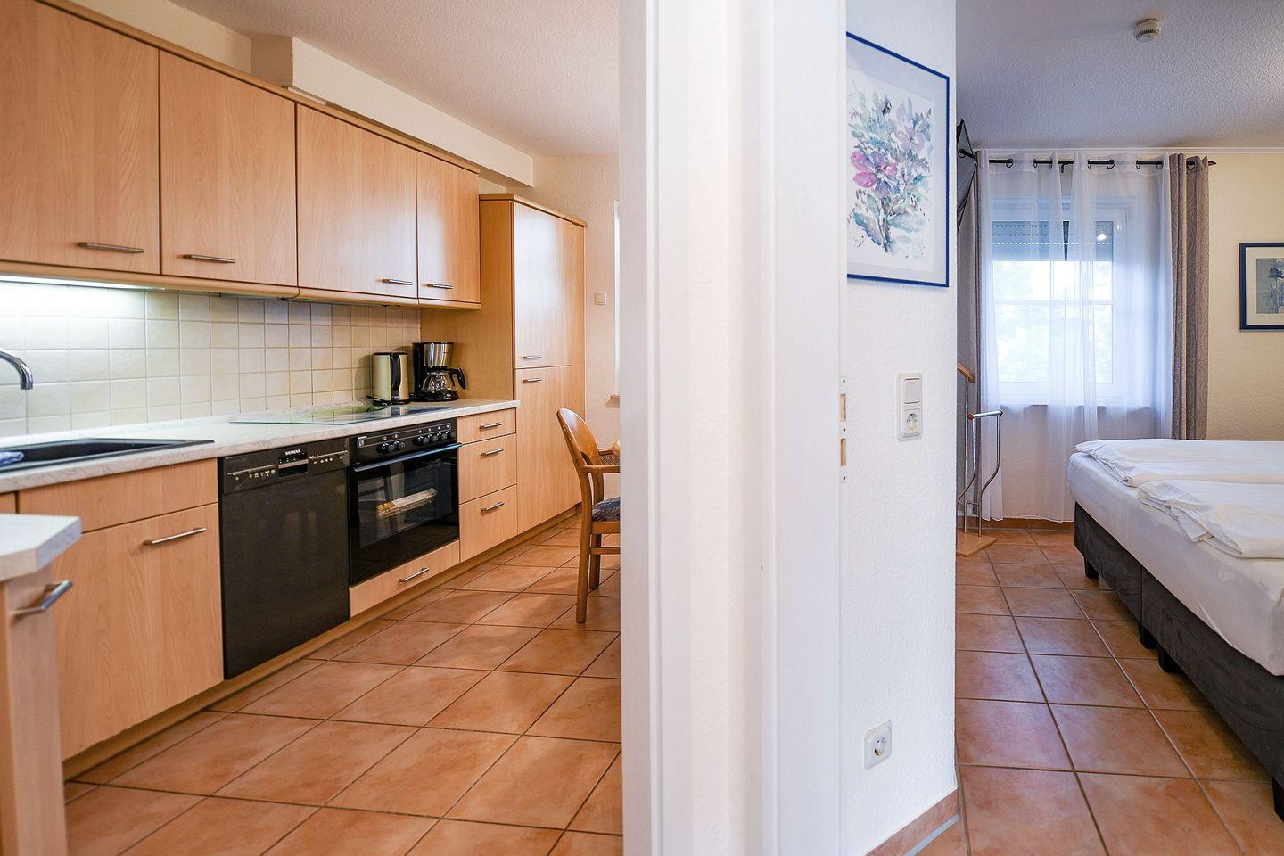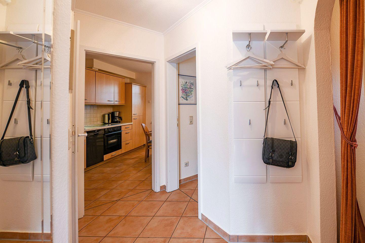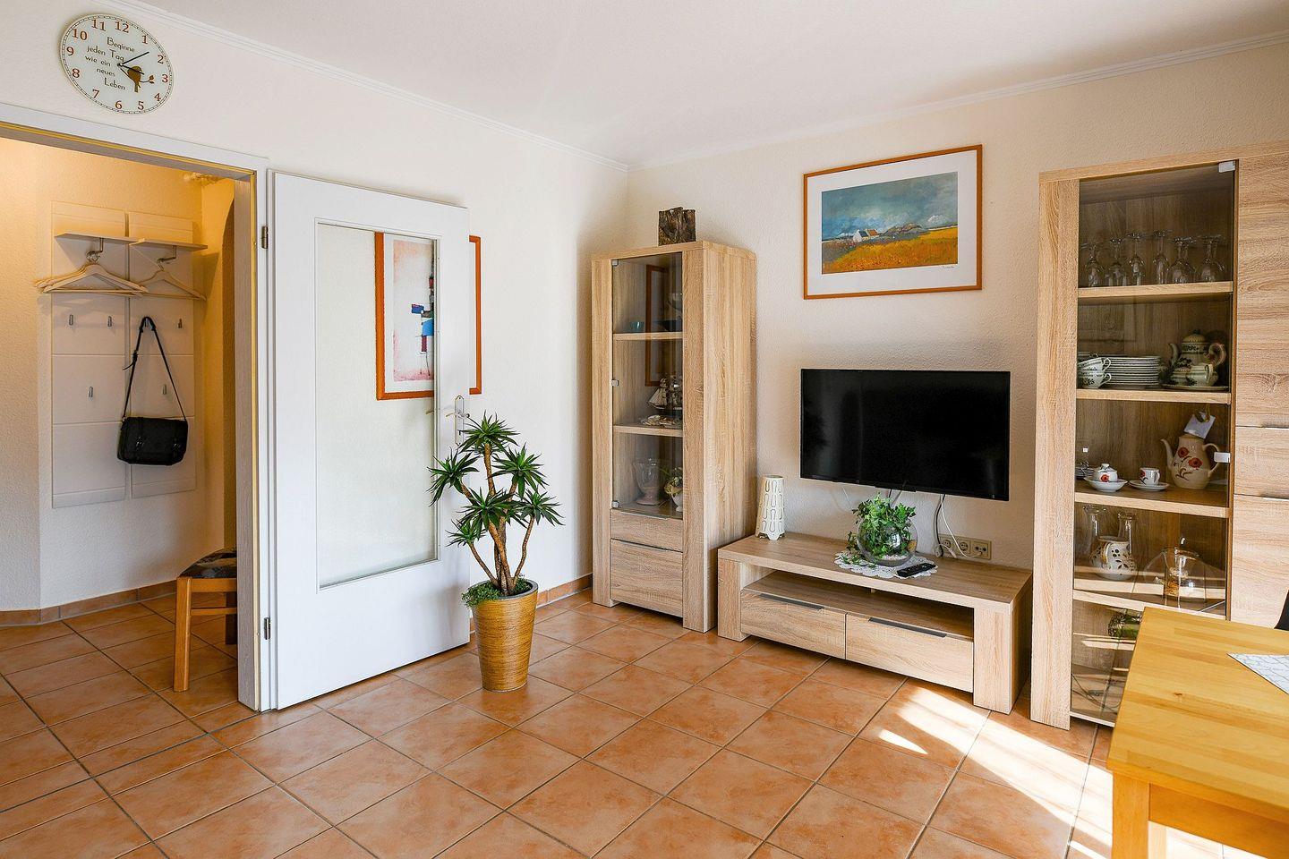 Die strandnahe Wohnung ist komfortabel ausgestattet: ein helles Bad mit eigener Waschmaschine, eine voll ausgestattete Küche mit Heißluftfritteuse sowie Fußbodenheizung, ein Schlafzimmer mit TV, ein weiterer Fernseher im Wohnbereich und WLAN sorgen zu jeder Jahreszeit für Erholung. In den warmen Monaten lädt die sonnige Südterrasse mit eigenem Gartenteil zu gemütlichen Stunden im Freien ein. Ein Parkplatz direkt vor dem Haus ermöglicht eine bequeme An- und Abreise, zusätzlich steht ein abschließbarer Fahrradraum zur Verfügung.