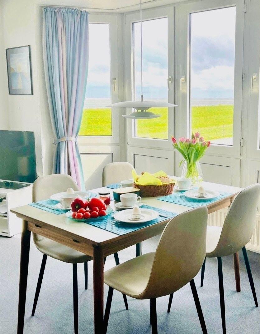 In der Nordseeperle 8 genießen Sie Panorama-Meerblick, Komfort und eine Toplage direkt hinter dem Deich, nur 2 Gehminuten vom Sandstrand entfernt. Die gemütliche Wohnung im 1. Obergeschoss bietet Platz für bis zu 4 Personen, ein separates Schlafzimmer sowie ein Schrankbett im Wohnbereich.
