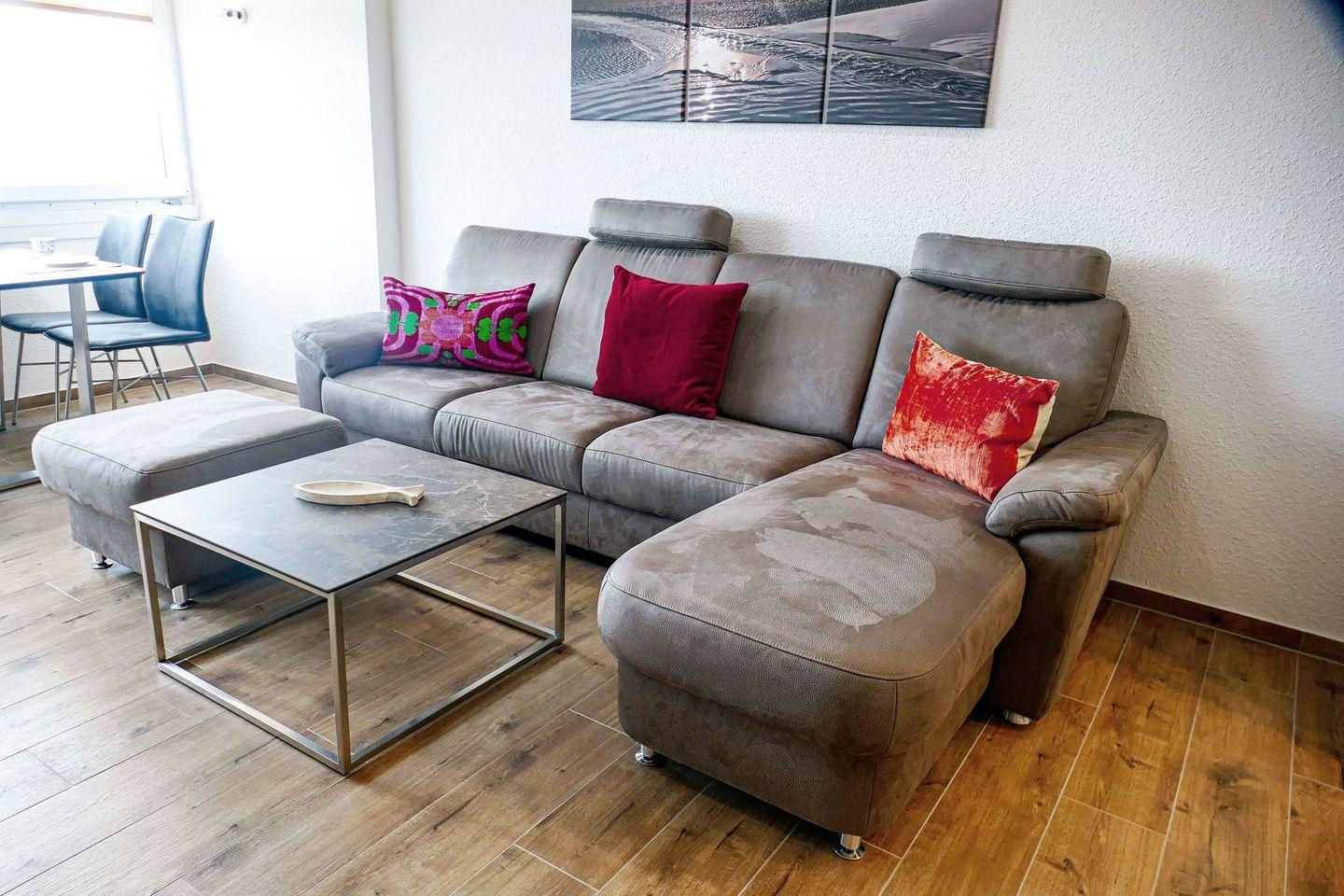 Die ca. 50m² große Ferienwohnung für 4 Personen begrüßt Sie mit modernem Flair, Schwimmbad, Sauna und viel Raum für einen entspannten Urlaub im schönen Norden Deutschlands - Meeresrauschen inklusive! Die lichtdurchflutete Ferienwohnung mit seitlicher Seesicht befindet sich in direkter Strandlage mit einer modernen, offenen und vollausgestatteten Küche, sodass Sie jeden Urlaubstag mit einem entspannten Frühstück am Meer beginnen können. Erholung während Ihres Strandurlaubs garantieren Ihnen, neben dem wunderbaren Sandstrand, die verglaste Südfensterfront zum Öffnen, das neue Bad mit einer Flachdusche, das Schwimmbad im eigenen Haus, sowie die Sauna, die gegen Gebühr genutzt werden kann. Der Flatscreen TV und das kostenfreie Wlan garantieren gemütliche und entspannte TV Abende, um sich vom langen Strandtag zu erholen und einfach die Seele baumeln zu lassen.