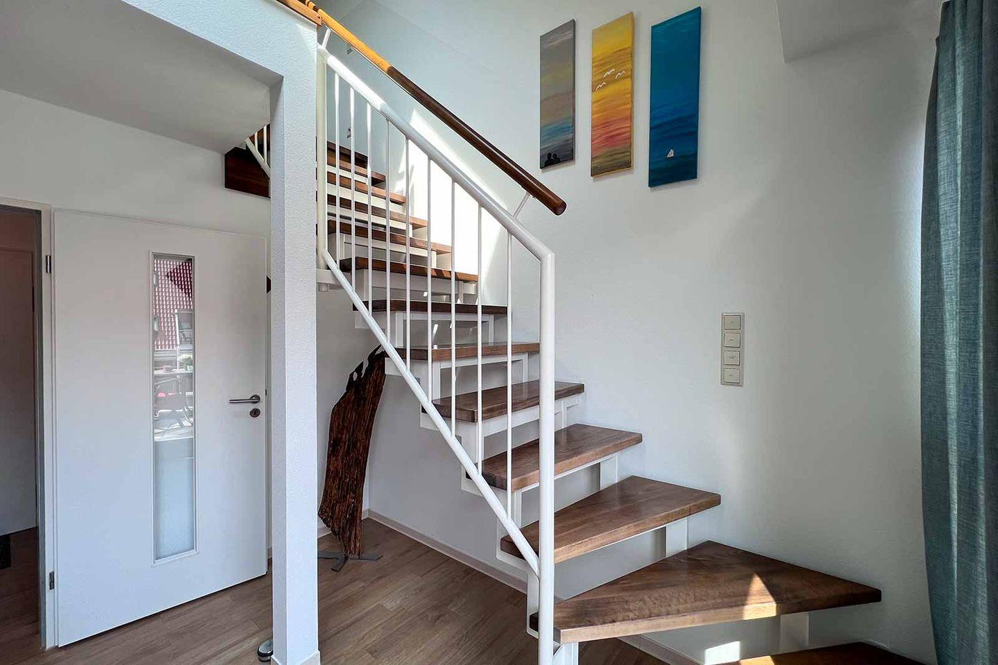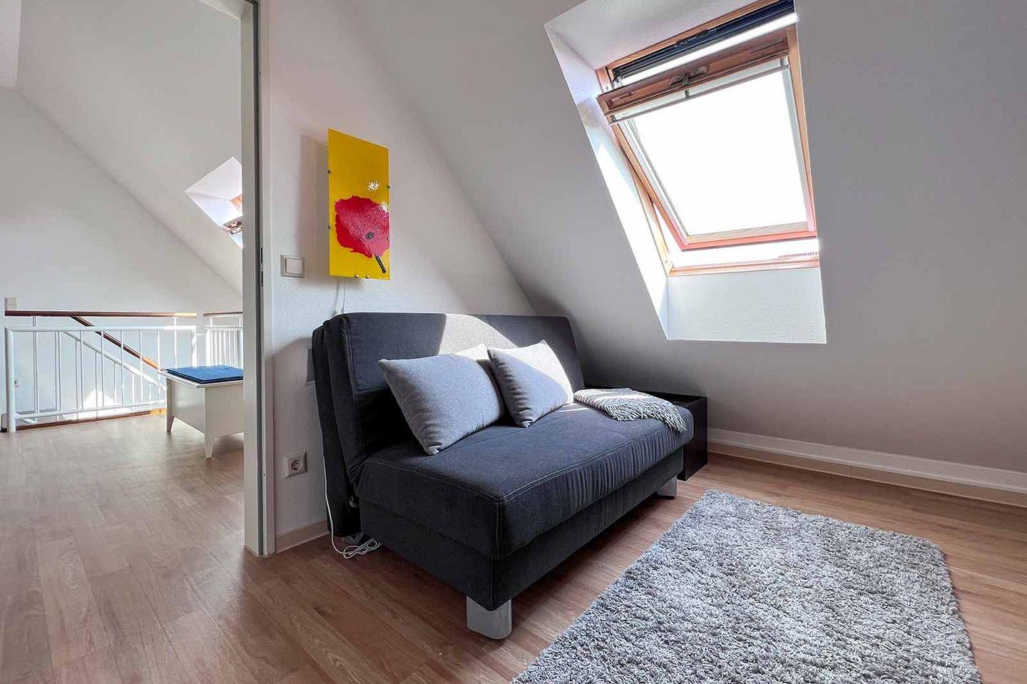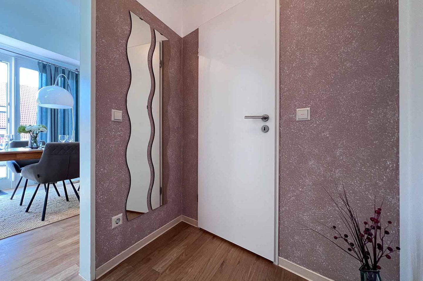 Die Wohnung befindet sich im vierten Stock eines gepflegten Mehrfamilienhauses und ist bequem über einen Aufzug erreichbar. Der geräumige Wohnbereich ist geschmackvoll eingerichtet und zeichnet sich durch einen hochwertigen Vinylboden aus. Hier können Sie entspannen und die gemeinsame Zeit genießen, etwa bei einem Filmabend vor dem Fernseher. Zudem stehen Ihnen eine HiFi-Anlage und ein DVD-Spieler zur Verfügung, sodass Sie sich auf ein unterhaltsames Freizeitprogramm freuen können.